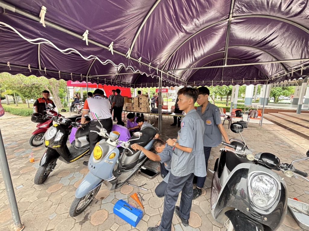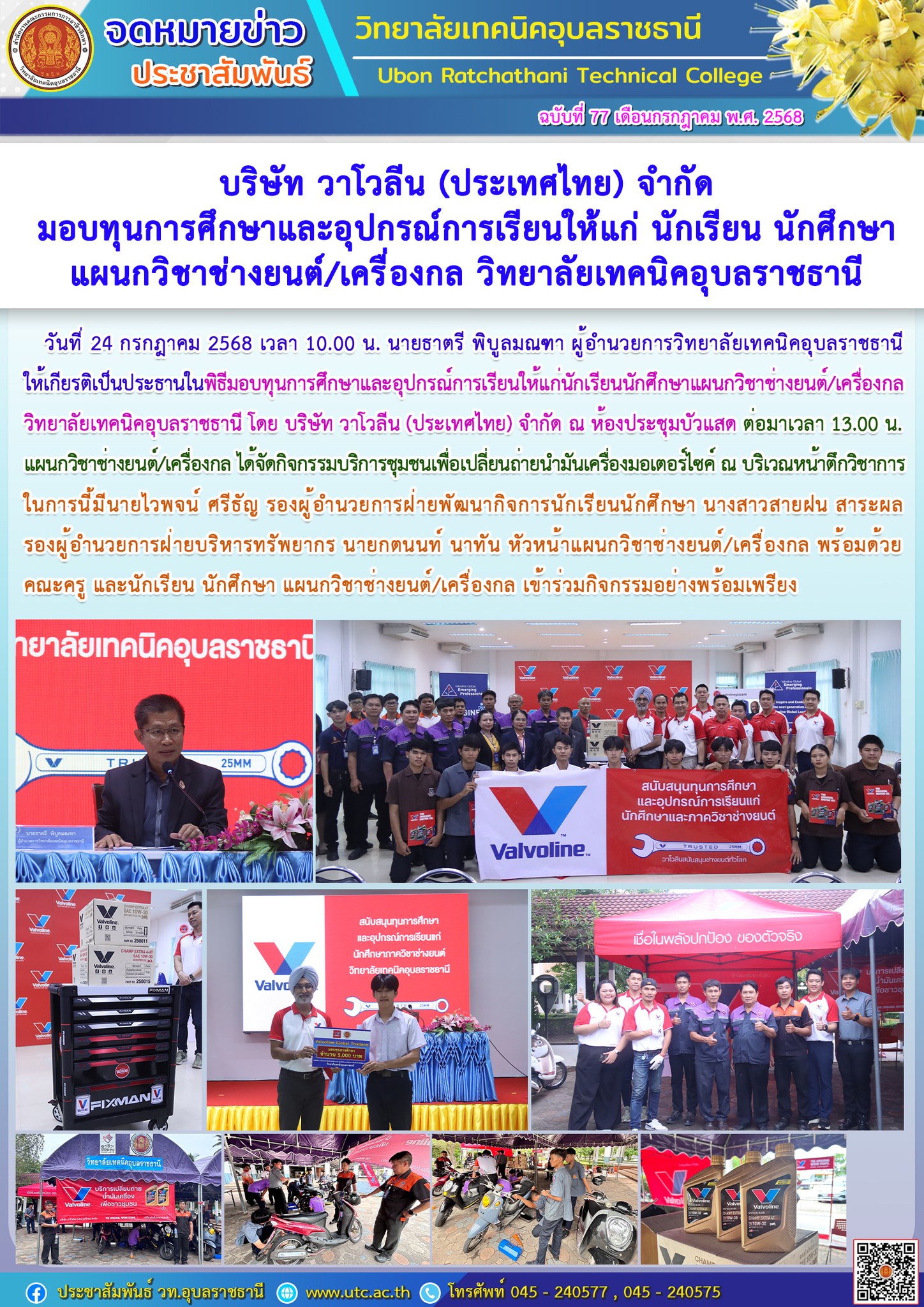 วันที่ 24 กรกฎาคม 2568 เวลา 10.00 น. นายธาตรี พิบูลมณฑา ผู้อำนวยการวิทยาลัยเทคนิคอุบลราชธานี ให้เกียรติเป็นประธานในพิธีมอบทุนการศึกษาและอุปกรณ์การเรียนให้แก่นักเรียนนักศึกษาแผนกวิชาช่างยนต์/เครื่องกล วิทยาลัยเทคนิคอุบลราชธานี โดย บริษัท วาโวลีน (ประเทศไทย) จำกัด ณ ห้องประชุมบัวแสด ต่อมาเวลา 13.00 น. แผนกวิชาช่างยนต์/เครื่องกล ได้จัดกิจกรรมบริการชุมชนเพื่อเปลี่ยนถ่ายนำมันเครื่องมอเตอร์ไซค์ ณ บริเวณหน้าตึกวิชาการ ในการนี้มีนายไวพจน์ ศรีธัญ รองผู้อำนวยการฝ่ายพัฒนากิจการนักเรียนนักศึกษา นางสาวสายฝน สาระผล รองผู้อำนวยการฝ่ายบริหารทรัพยากร นายกตนนท์ นาทัน หัวหน้าแผนกวิชาช่างยนต์/เครื่องกล พร้อมด้วยคณะครู และนักเรียน นักศึกษา แผนกวิชาช่างยนต์/เครื่องกล เข้าร่วมกิจกรรมอย่างพร้อมเพรียง