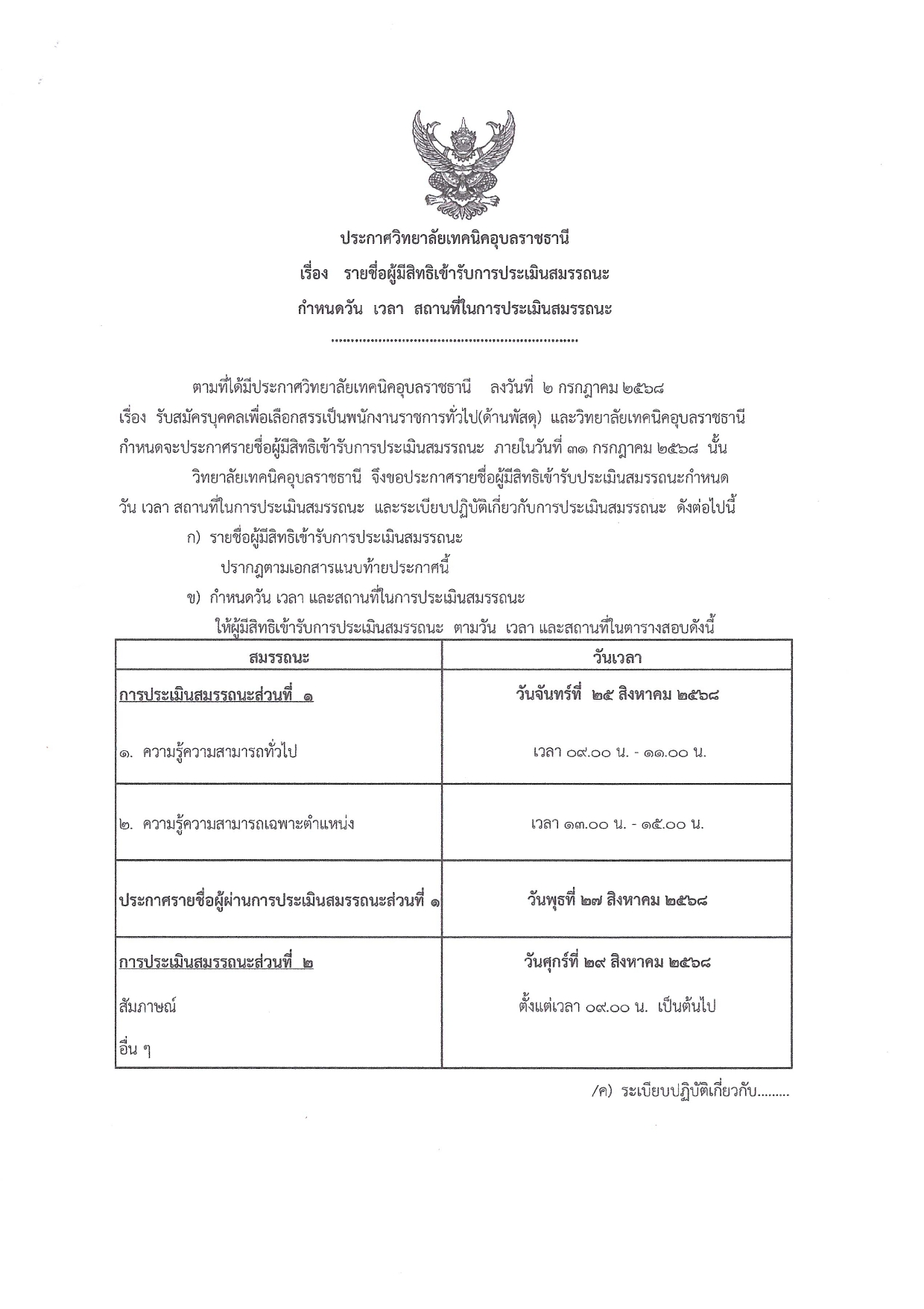 เรื่อง รายชื่อผู้มีสิทธ์เข้ารับการประเมินสมรรถนะ กำหนดวัน เวลา สถานที่ในการประเมินสมรรถนะ