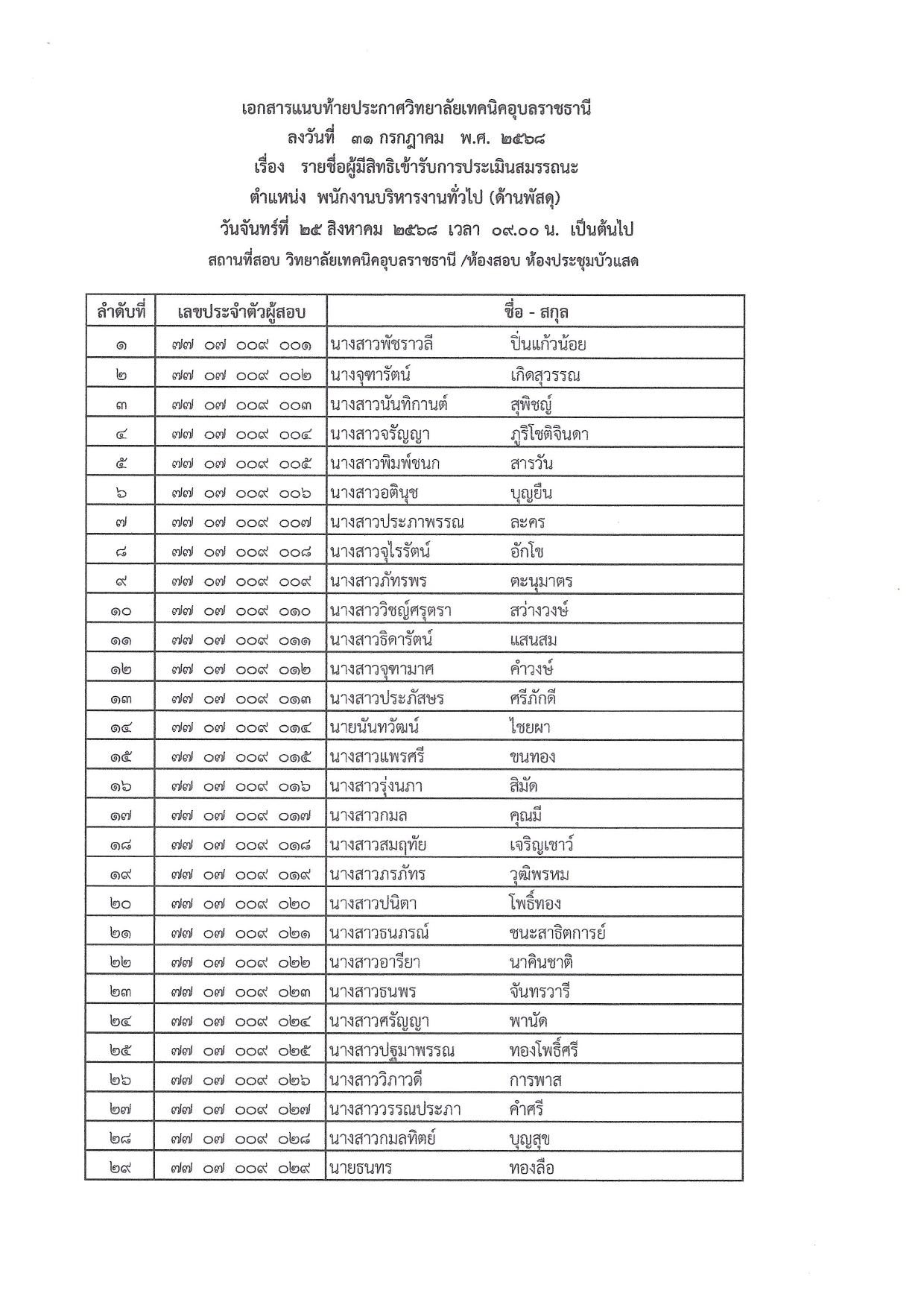 เรื่อง รายชื่อผู้มีสิทธ์เข้ารับการประเมินสมรรถนะ กำหนดวัน เวลา สถานที่ในการประเมินสมรรถนะ ตำแหน่ง พนักงานราชการทั่วไป (ด้านพัสดุ)