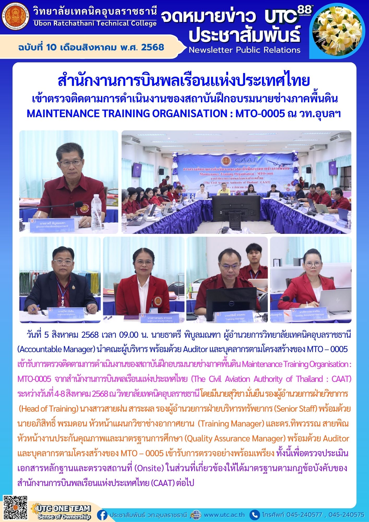 วันที่ 6 สิงหาคม 2568 เวลา 09.00 น. นายธาตรี พิบูลมณฑา ผู้อำนวยการวิทยาลัยเทคนิคอุบลราชธานี (Accountable Manager) นำคณะผู้บริหาร พร้อมด้วย Auditor และบุคลากรตามโครงสร้างของ MTO – 0005 เข้ารับการตรวจติดตามการดำเนินงานของสถาบันฝึกอบรมนายช่างภาคพื้นดิน Maintenance Training Organisation : MTO-0005 จากสำนักงานการบินพลเรือนแห่งประเทศไทย (The Civil Aviation Authority of Thailand : CAAT) ระหว่างวันที่ 4-8 สิงหาคม 2568 ณ วิทยาลัยเทคนิคอุบลราชธานี โดยมีนายสุวิชา มั่นยืน รองผู้อำนวยการฝ่ายวิชาการ (Head of Training) นางสาวสายฝน สาระผล รองผู้อำนวยการฝ่ายบริหารทรัพยากร (Senior Staff) พร้อมด้วยนายอภิสิทธิ์ พรมดอน หัวหน้าแผนกวิชาช่างอากาศยาน (Training Manager) และดร.ทิพวรรณ สายพิณ หัวหน้างานประกันคุณภาพและมาตรฐานการศึกษา (Quality Assurance Manager) พร้อมด้วย Auditor และบุคลากรตามโครงสร้างของ MTO – 0005 เข้ารับการตรวจอย่างพร้อมเพรียง ทั้งนี้เพื่อตรวจประเมินเอกสารหลักฐานและตรวจสถานที่ (Onsite) ในส่วนที่เกี่ยวข้องให้ได้มาตรฐานตามกฎข้อบังคับของสำนักงานการบินพลเรือนแห่งประเทศไทย (CAAT) ต่อไป
