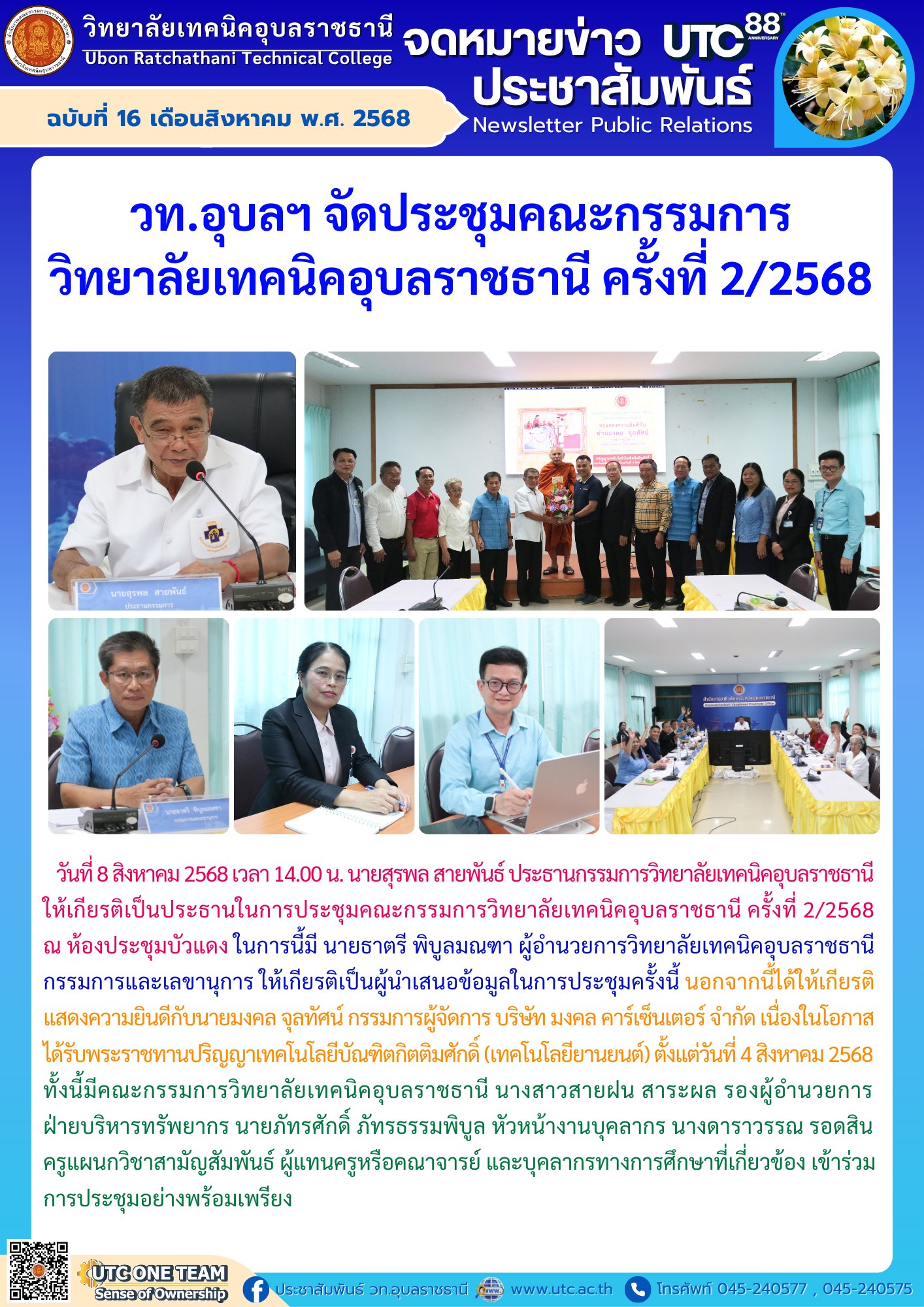 วันที่ 8 สิงหาคม 2568 เวลา 14.00 น. นายสุรพล สายพันธ์ ประธานกรรมการวิทยาลัยเทคนิคอุบลราชธานี ให้เกียรติเป็นประธานในการประชุมคณะกรรมการวิทยาลัยเทคนิคอุบลราชธานี ครั้งที่ 2/2568 ณ ห้องประชุมบัวแดง ในการนี้มี นายธาตรี พิบูลมณฑา ผู้อำนวยการวิทยาลัยเทคนิคอุบลราชธานี ให้เกียรติเป็นกรรมการและเลขานุการในการประชุมครั้งนี้ นอกจากนี้ได้ให้เกียรติแสดงความยินดีกับนายมงคล จุลทัศน์ กรรมการผู้จัดการ บริษัท มงคล คาร์เซ็นเตอร์ จำกัด เนื่องในโอกาสได้รับพระราชทานปริญญาเทคโนโลยีบัณฑิตกิตติมศักดิ์ (เทคโนโลยียานยนต์) ตั้งแต่วันที่ 4 สิงหาคม 2568 ทั้งนี้มีคณะกรรมการวิทยาลัยเทคนิคอุบลราชธานี นางสาวสายฝน สาระผล รองผู้อำนวยการฝ่ายบริหารทรัพยากร นายภัทรศักดิ์ ภัทรธรรมพิบูล หัวหน้างานบุคลากร นางดาราวรรณ รอดสิน ครูแผนกวิชาสามัญสัมพันธ์ ผู้แทนครูหรือคณาจารย์ และบุคลากรทางการศึกษาที่เกี่ยวข้อง เข้าร่วมการประชุมอย่างพร้อมเพรียง