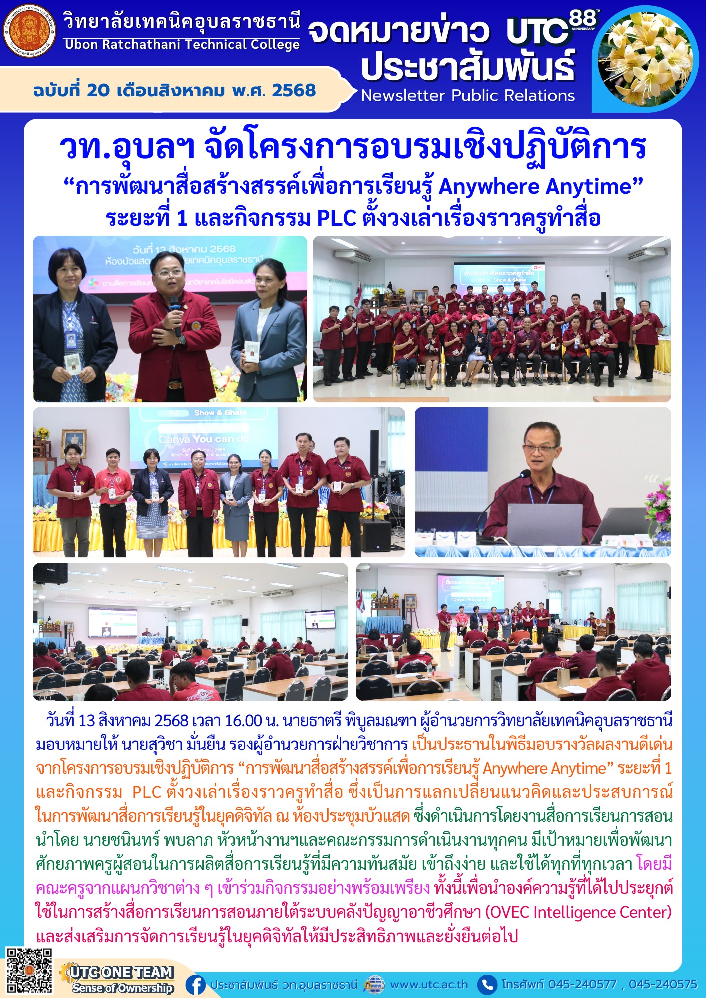 วันที่ 13 สิงหาคม 2568 เวลา 16.00 น. นายธาตรี พิบูลมณฑา ผู้อำนวยการวิทยาลัยเทคนิคอุบลราชธานี มอบหมายให้ นายสุวิชา มั่นยืน รองผู้อำนวยการฝ่ายวิชาการ เป็นประธานในพิธีมอบรางวัลผลงานดีเด่นจากโครงการอบรมเชิงปฏิบัติการ “การพัฒนาสื่อสร้างสรรค์เพื่อการเรียนรู้ Anywhere Anytime”ระยะที่ 1 และกิจกรรม PLC ตั้งวงเล่าเรื่องราวครูทำสื่อ ซึ่งเป็นการแลกเปลี่ยนแนวคิดและประสบการณ์ในการพัฒนาสื่อการเรียนรู้ในยุคดิจิทัล ณ ห้องประชุมบัวแสด ซึ่งดำเนินการโดยงานสื่อการเรียนการสอน นำโดย นายชนินทร์ พบลาภ หัวหน้างานฯและคณะกรรมการดำเนินงานทุกคน มีเป้าหมายเพื่อพัฒนาศักยภาพครูผู้สอนในการผลิตสื่อการเรียนรู้ที่มีความทันสมัย เข้าถึงง่าย และใช้ได้ทุกที่ทุกเวลา โดยมีคณะครูจากแผนกวิชาต่าง ๆ เข้าร่วมกิจกรรมอย่างพร้อมเพรียง ทั้งนี้เพื่อนำองค์ความรู้ที่ได้ไปประยุกต์ใช้ในการสร้างสื่อการเรียนการสอนภายใต้ระบบคลังปัญญาอาชีวศึกษา (OVEC Intelligence Center) และส่งเสริมการจัดการเรียนรู้ในยุคดิจิทัลให้มีประสิทธิภาพและยั่งยืนต่อไป