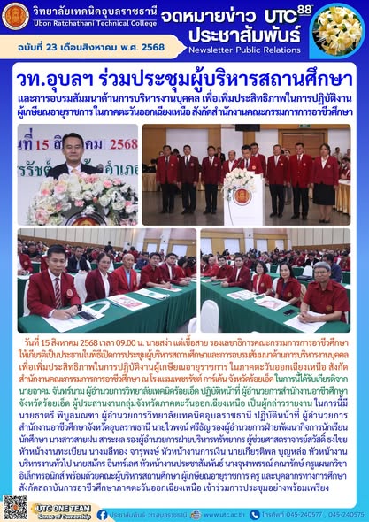 วท.อุบลฯ ร่วมประชุมผู้บริหารสถานศึกษาและการอบรมสัมมนาด้านการบริหารงานบุคคล เพื่อเพิ่มประสิทธิภาพในการปฏิบัติงานผู้เกษียณอายุราชการ ในภาคตะวันออกเฉียงเหนือ สังกัดสำนักงานคณะกรรมการการอาชีวศึกษา