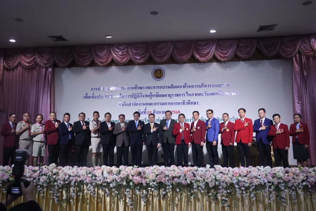 วันที่ 15 สิงหาคม 2568 เวลา 09.00 น. นายสง่า แต่เชื้อสาย รองเลขาธิการคณะกรรมการการอาชีวศึกษา ให้เกียรติเป็นประธานในพิธีเปิดการประชุมผู้บริหารสถานศึกษาและการอบรมสัมมนาด้านการบริหารงานบุคคล เพื่อเพิ่มประสิทธิภาพในการปฏิบัติงานผู้เกษียณอายุราชการ ในภาคตะวันออกเฉียงเหนือ สังกัดสำนักงานคณะกรรมการการอาชีวศึกษา ณ โรงแรมเพชรรัชต์ การ์เด้น จังหวัดร้อยเอ็ด ในการนี้มี นายอาคม จันทร์นาม ผู้อำนวยการวิทยาลัยเทคนิคร้อยเอ็ด ปฏิบัติหน้าที่ ผู้อำนวยการสำนักงานอาชีวศึกษาจังหวัดร้อยเอ็ด ผู้ประสานงานกลุ่มจังหวัดภาคตะวันออกเฉียงเหนือ เป็นผู้กล่าวรายงาน ในการนี้มี นายธาตรี พิบูลมณฑา ผู้อำนวยการวิทยาลัยเทคนิคอุบลราชธานี ปฏิบัติหน้าที่ ผู้อำนวยการสำนักงานอาชีวศึกษาจังหวัดอุบลราชธานี นายไวพจน์ ศรีธัญ รองผู้อำนวยการฝ่ายพัฒนากิจการนักเรียนนักศึกษา นางสาวสายฝน สาระผล รองผู้อำนวยการฝ่ายบริหารทรัพยากร ผู้ช่วยศาสตราจารย์สวัสดิ์ ธงไชย หัวหน้างานทะเบียน นางมลีทอง จารุพงษ์ หัวหน้างานการเงิน นายเกียรติพล บุญหล่อ หัวหน้างานบริหารงานทั่วไป นายสมัคร อินทร์เลศ หัวหน้างานประชาสัมพันธ์ นางจุฬาพรรณ์ คณารักษ์ ครูแผนกวิชาอิเล็กทรอนิกส์ พร้อมด้วยคณะผู้บริหารสถานศึกษา ผู้เกษียณอายุราชการ ครู และบุคลากรทางการศึกษา สังกัดสถาบันการอาชีวศึกษาภาคตะวันออกเฉียงเหนือ เข้าร่วมการประชุมอย่างพร้อมเพรียง