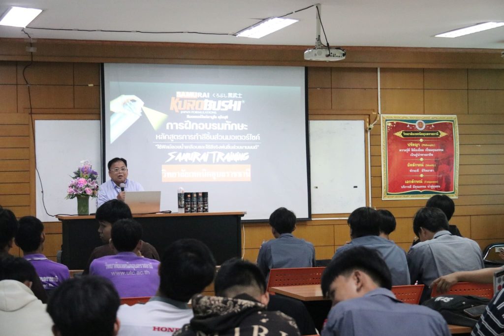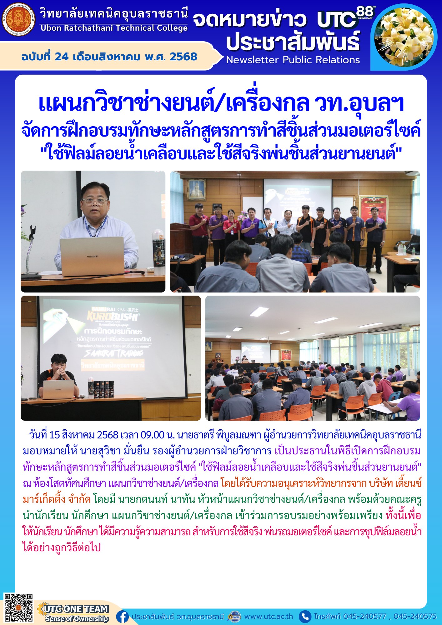 วันที่ 15 สิงหาคม 2568 เวลา 09.00 น. นายธาตรี พิบูลมณฑา ผู้อำนวยการวิทยาลัยเทคนิคอุบลราชธานี มอบหมายให้ นายสุวิชา มั่นยืน รองผู้อำนวยการฝ่ายวิชาการ เป็นประธานในพิธีเปิดการฝึกอบรมทักษะหลักสูตรการทำสีชิ้นส่วนมอเตอร์ไซค์ “ใช้ฟิลม์ลอยน้ำเคลือบและใช้สีจริงพ่นชิ้นส่วนยานยนต์” ณ ห้องโสตทัศนศึกษา แผนกวิชาช่างยนต์/เครื่องกล โดยได้รับความอนุเคราะห์วิทยากรจาก บริษัท เดี้ยนซ์ มาร์เก็ตติ้ง จำกัด โดยมี นายกตนนท์ นาทัน หัวหน้าแผนกวิชาช่างยนต์/เครื่องกล พร้อมด้วยคณะครู นำนักเรียน นักศึกษา แผนกวิชาช่างยนต์/เครื่องกล เข้าร่วมการอบรมอย่างพร้อมเพรียง ทั้งนี้เพื่อให้นักเรียน นักศึกษา ได้มีความรู้ความสามารถ สำหรับการใช้สีจริง พ่นรถมอเตอร์ไซค์ และการชุปฟิล์มลอยน้ำ ได้อย่างถูกวิธีต่อไป