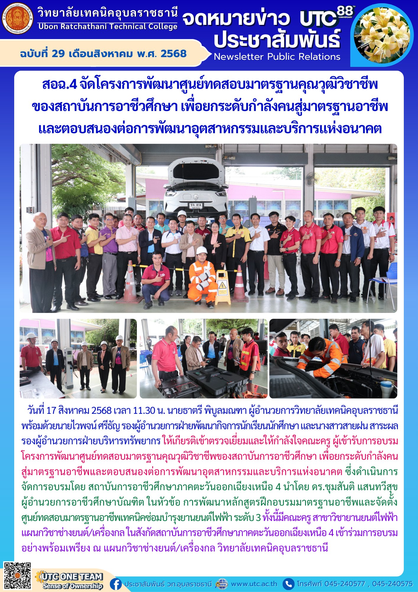 วันที่ 17 สิงหาคม 2568 เวลา 11.30 น. นายธาตรี พิบูลมณฑา ผู้อำนวยการวิทยาลัยเทคนิคอุบลราชธานี พร้อมด้วยนายไวพจน์ ศรีธัญ รองผู้อำนวยการฝ่ายพัฒนากิจการนักเรียนนักศึกษา และนางสาวสายฝน สาระผล รองผู้อำนวยการฝ่ายบริหารทรัพยากร ให้เกียรติเข้าตรวจเยี่ยมและให้กำลังใจคณะครู ผู้เข้ารับการอบรมโครงการพัฒนาศูนย์ทดสอบมาตรฐานคุณวุฒิวิชาชีพของสถาบันการอาชีวศึกษา เพื่อยกระดับกำลังคนสู่มาตรฐานอาชีพและตอบสนองต่อการพัฒนาอุตสาหกรรมและบริการแห่งอนาคต ซึ่งดำเนินการจัดการอบรมโดย สถาบันการอาชีวศึกษาภาคตะวันออกเฉียงเหนือ 4 นำโดย ดร.ชุมสันติ แสนทวีสุข ผู้อำนวยการอาชีวศึกษาบัณฑิต ในหัวข้อ การพัฒนาหลักสูตรฝึกอบรมมาตรฐานอาชีพและจัดตั้งศูนย์ทดสอบมาตรฐานอาชีพเทคนิคซ่อมบำรุงยานยนต์ไฟฟ้า ระดับ 3 ทั้งนี้มีคณะครู สาขาวิชายานยนต์ไฟฟ้า แผนกวิชาช่างยนต์/เครื่องกล ในสังกัดสถาบันการอาชีวศึกษาภาคตะวันออกเฉียงเหนือ 4 เข้าร่วมการอบรมอย่างพร้อมเพรียง ณ แผนกวิชาช่างยนต์/เครื่องกล วิทยาลัยเทคนิคอุบลราชธานี