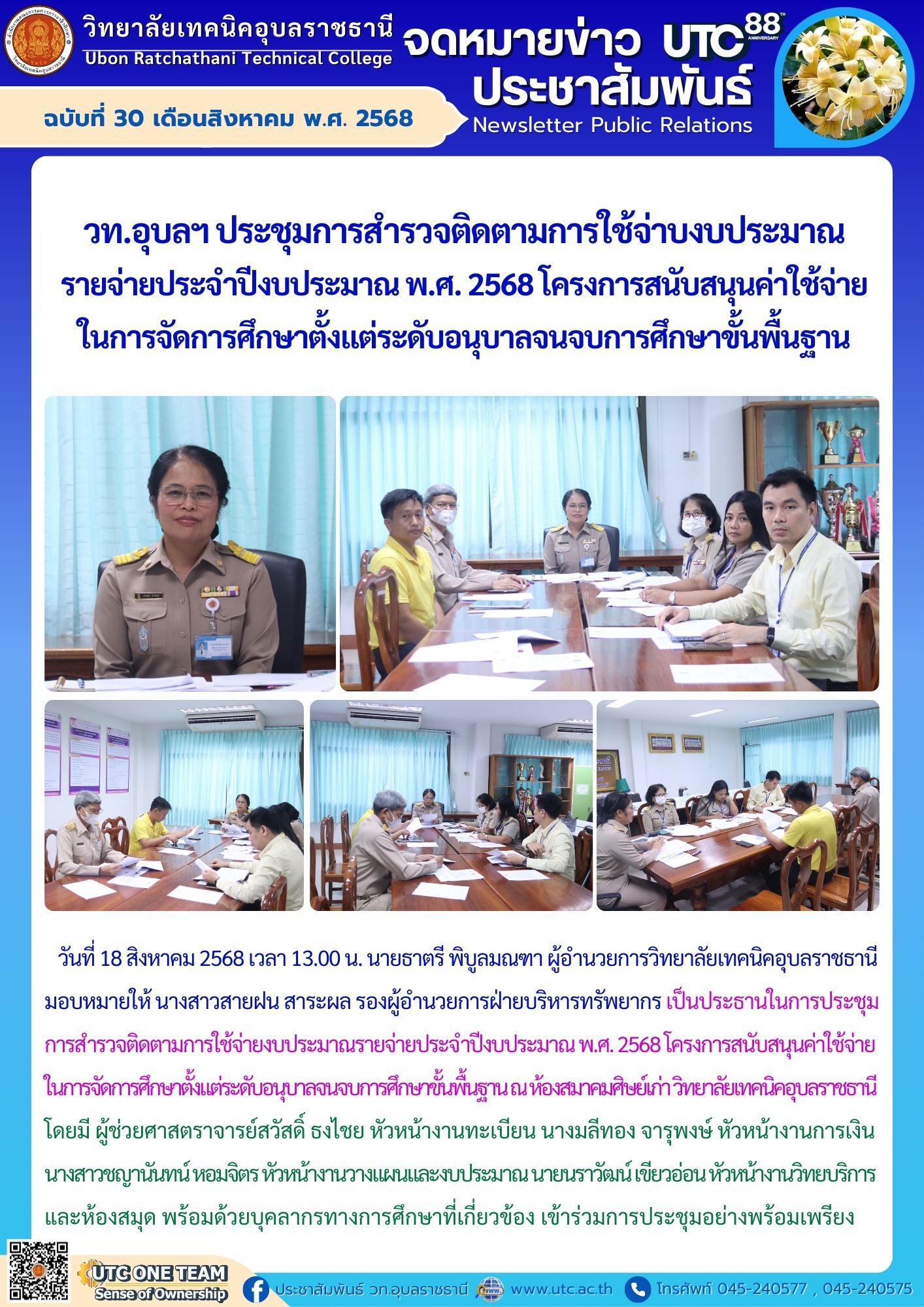 วท.อุบลฯ ประชุมการสำรวจติดตามการใช้จ่ายงบประมาณรายจ่ายประจำปีงบประมาณ พ.ศ. 2568 โครงการสนับสนุนค่าใช้จ่ายในการจัดการศึกษาตั้งแต่ระดับอนุบาลจนจบการศึกษาขั้นพื้นฐาน