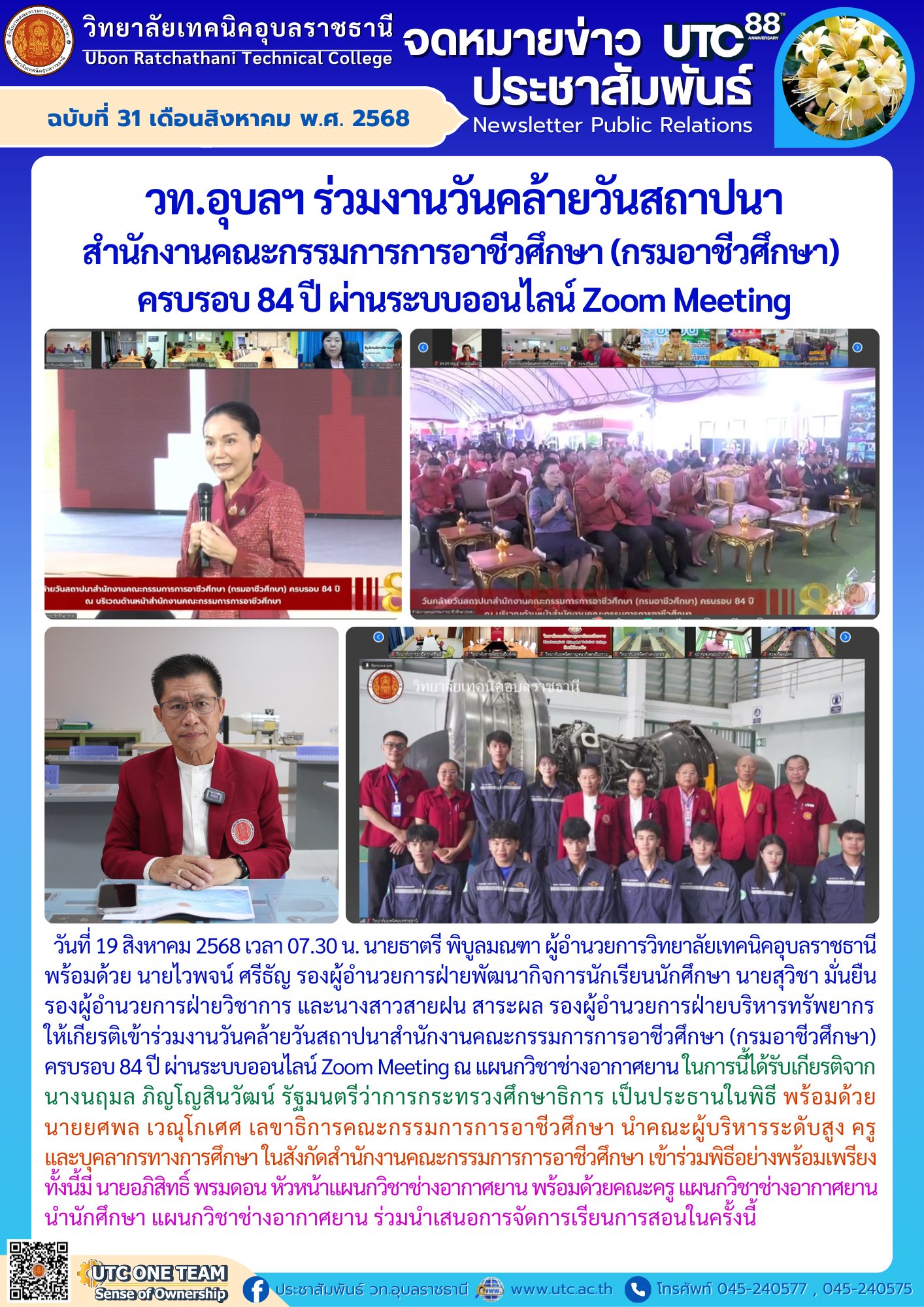 วันที่ 19 สิงหาคม 2568 เวลา 07.30 น. นายธาตรี พิบูลมณฑา ผู้อำนวยการวิทยาลัยเทคนิคอุบลราชธานี พร้อมด้วย นายไวพจน์ ศรีธัญ รองผู้อำนวยการฝ่ายพัฒนากิจการนักเรียนนักศึกษา นายสุวิชา มั่นยืน รองผู้อำนวยการฝ่ายวิชาการ และนางสาวสายฝน สาระผล รองผู้อำนวยการฝ่ายบริหารทรัพยากร ให้เกียรติเข้าร่วมงานวันคล้ายวันสถาปนาสำนักงานคณะกรรมการการอาชีวศึกษา (กรมอาชีวศึกษา) ครบรอบ 84 ปี ผ่านระบบออนไลน์ Zoom Meeting ณ แผนกวิชาช่างอากาศยาน ในการนี้ได้รับเกียรติจาก นางนฤมล ภิญโญสินวัฒน์ รัฐมนตรีว่าการกระทรวงศึกษาธิการ เป็นประธานในพิธี พร้อมด้วย นายยศพล เวณุโกเศศ เลขาธิการคณะกรรมการการอาชีวศึกษา นำคณะผู้บริหารระดับสูง ครู และบุคลากรทางการศึกษา ในสังกัดสำนักงานคณะกรรมการการอาชีวศึกษา เข้าร่วมพิธีอย่างพร้อมเพรียง ทั้งนี้มี นายอภิสิทธิ์ พรมดอน หัวหน้าแผนกวิชาช่างอากาศยาน พร้อมด้วยคณะครู แผนกวิชาช่างอากาศยาน นำนักศึกษา แผนกวิชาช่างอากาศยาน ร่วมนำเสนอการจัดการเรียนการสอนในครั้งนี้