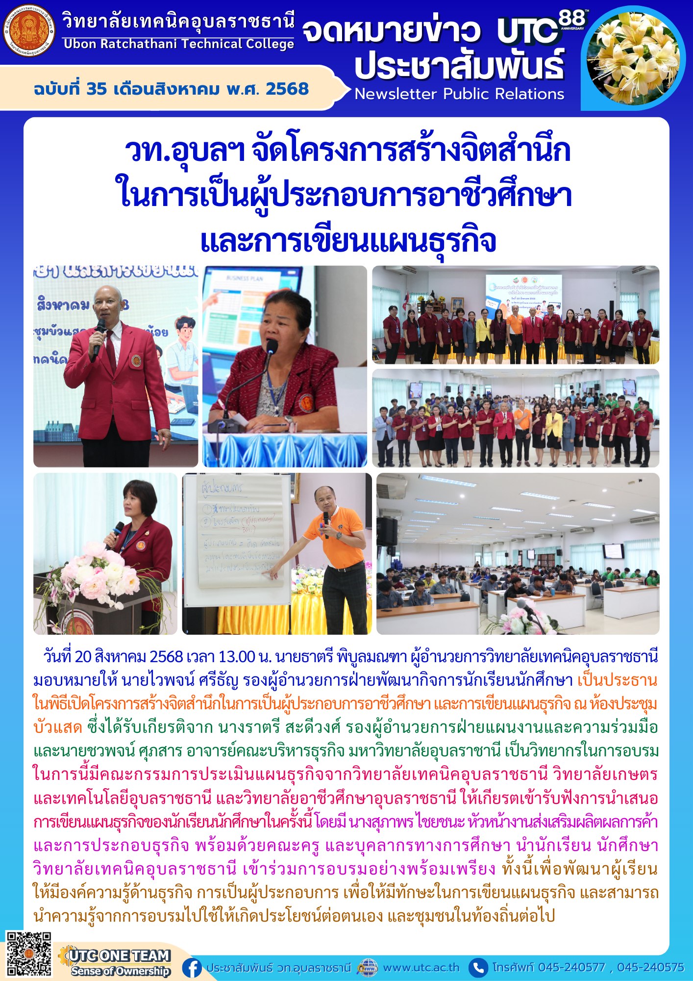 วันที่ 20 สิงหาคม 2568 เวลา 13.00 น. นายธาตรี พิบูลมณฑา ผู้อำนวยการวิทยาลัยเทคนิคอุบลราชธานี มอบหมายให้ นายไวพจน์ ศรีธัญ รองผู้อำนวยการฝ่ายพัฒนากิจการนักเรียนนักศึกษา เป็นประธานในพิธีเปิดโครงการสร้างจิตสำนึกในการเป็นผู้ประกอบการอาชีวศึกษา และการเขียนแผนธุรกิจ ณ ห้องประชุมบัวแสด ซึ่งได้รับเกียรติจาก นางราตรี สะดีวงศ์ รองผู้อำนวยการฝ่ายแผนงานและความร่วมมือ และนายชวพจน์ ศุภสาร อาจารย์คณะบริหารธุรกิจ มหาวิทยาลัยอุบลราชานี เป็นวิทยากรในการอบรม ในการนี้มีคณะกรรมการประเมินแผนธุรกิจจากวิทยาลัยเทคนิคอุบลราชธานี วิทยาลัยเกษตรและเทคโนโลยีอุบลราชธานี และวิทยาลัยอาชีวศึกษาอุบลราชธานี ให้เกียรตเข้ารับฟังการนำเสนอการเขียนแผนธุรกิจของนักเรียนนักศึกษาในครั้งนี้ โดยมี นางสุภาพร ไชยชนะ หัวหน้างานส่งเสริมผลิตผลการค้าและการประกอบธุรกิจ พร้อมด้วยคณะครู บุคลากรทางการศึกษา นำนักเรียน นักศึกษา วิทยาลัยเทคนิคอุบลราชธานี เข้าร่วมการอบรมอย่างพร้อมเพรียง ทั้งนี้เพื่อพัฒนาผู้เรียน ให้มีองค์ความรู้ด้านธุรกิจ การเป็นผู้ประกอบการ เพื่อให้มีทักษะในการเขียนแผนธุรกิจ และสามารถนำความรู้จากการอบรมไปใช้ให้เกิดประโยชน์ต่อตนเอง และชุมชนในท้องถิ่นต่อไป