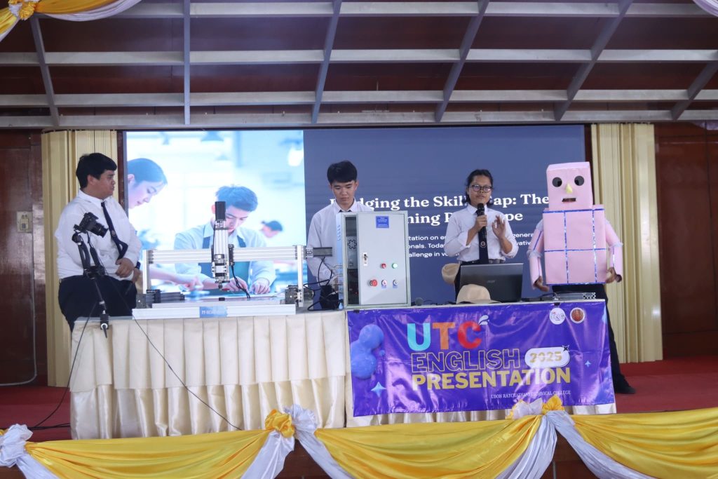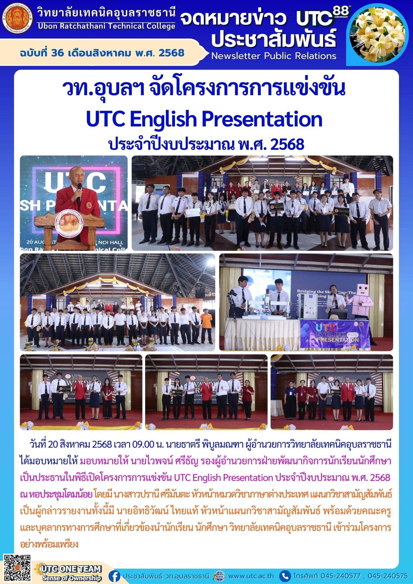 วันที่ 20 สิงหาคม 2568 เวลา 13.00 น. นายธาตรี พิบูลมณฑา ผู้อำนวยการวิทยาลัยเทคนิคอุบลราชธานี มอบหมายให้ นายไวพจน์ ศรีธัญ รองผู้อำนวยการฝ่ายพัฒนากิจการนักเรียนนักศึกษา เป็นประธานในพิธีเปิดโครงการการแข่งขัน UTC English Presentation ประจำปีงบประมาณ พ.ศ. 2568 ณ หอประชุมโดมน้อย โดยมี นางสาวปรานี ศรีมันตะ หัวหน้าหมวดวิชาภาษาต่างประเทศ แผนกวิชาสามัญสัมพันธ์ เป็นผู้กล่าวรายงานทั้งนี้มี นายอิทธิวัฒน์ ไทยแท้ หัวหน้าแผนกวิชาสามัญสัมพันธ์ พร้อมด้วยคณะครู และบุคลากรทางการศึกษาที่เกี่ยวข้องนำนักเรียน นักศึกษา วิทยาลัยเทคนิคอุบลราชธานี เข้าร่วมโครงการอย่างพร้อมเพรียง