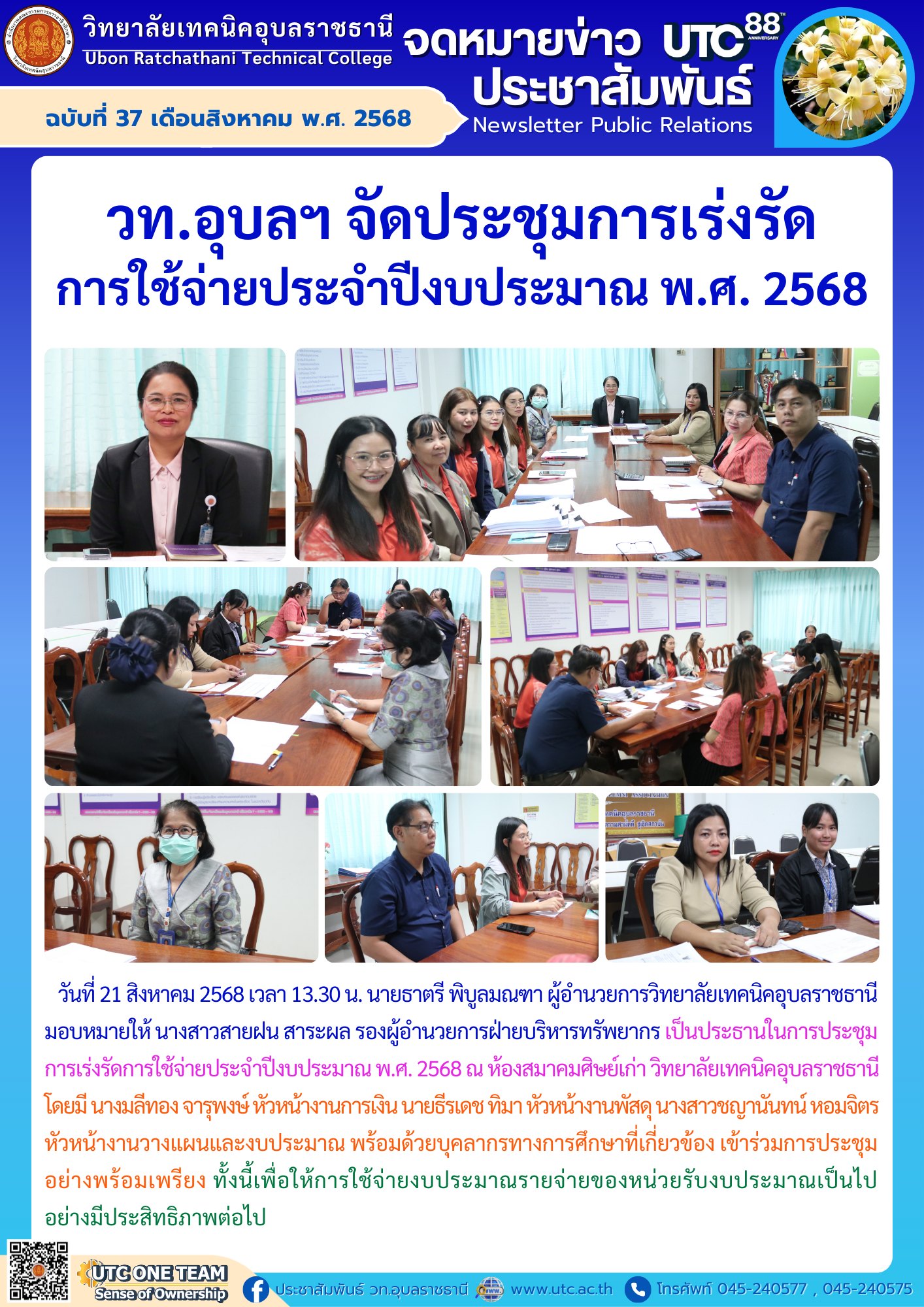 วันที่ 21 สิงหาคม 2568 เวลา 13.30 น. นายธาตรี พิบูลมณฑา ผู้อำนวยการวิทยาลัยเทคนิคอุบลราชธานี มอบหมายให้ นางสาวสายฝน สาระผล รองผู้อำนวยการฝ่ายบริหารทรัพยากร เป็นประธานในการประชุมการเร่งรัดการใช้จ่ายประจำปีงบประมาณ พ.ศ. 2568 ณ ห้องสมาคมศิษย์เก่า วิทยาลัยเทคนิคอุบลราชธานี โดยมี นางมลีทอง จารุพงษ์ หัวหน้างานการเงิน นายธีรเดช ทิมา หัวหน้างานพัสดุ นางสาวชญานันทน์ หอมจิตร หัวหน้างานวางแผนและงบประมาณ พร้อมด้วยบุคลากรทางการศึกษาที่เกี่ยวข้อง เข้าร่วมการประชุมอย่างพร้อมเพรียง ทั้งนี้เพื่อให้การใช้จ่ายงบประมาณรายจ่ายของหน่วยรับงบประมาณเป็นไปอย่างมีประสิทธิภาพต่อไป