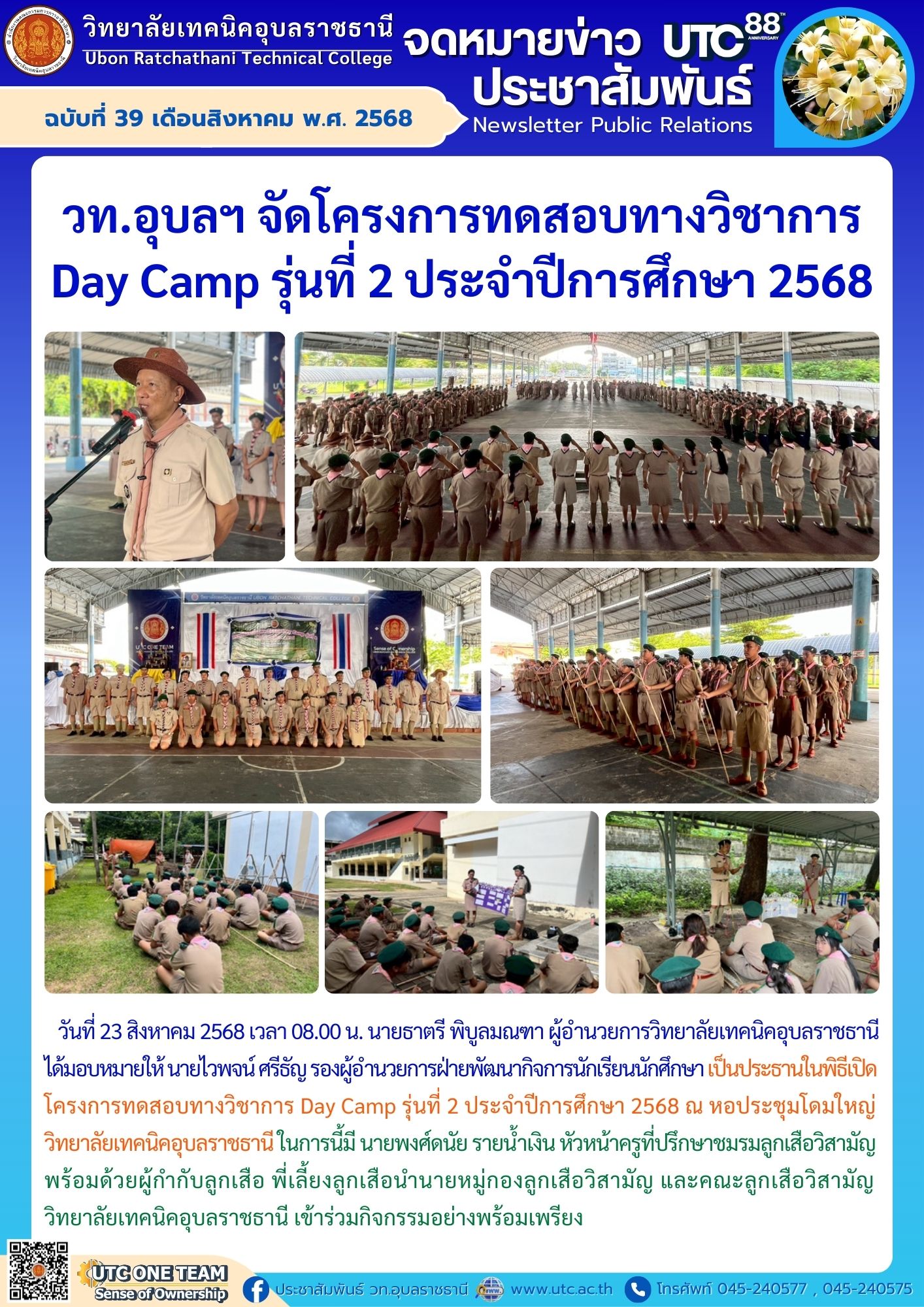 วันที่ 23 สิงหาคม 2568 เวลา 08.00 น. นายธาตรี พิบูลมณฑา ผู้อำนวยการวิทยาลัยเทคนิคอุบลราชธานี ได้มอบหมายให้ นายไวพจน์ ศรีธัญ รองผู้อำนวยการฝ่ายพัฒนากิจการนักเรียนนักศึกษา เป็นประธานในพิธีเปิดโครงการทดสอบทางวิชาการ Day Camp รุ่นที่ 2 ประจำปีการศึกษา 2568 ณ หอประชุมโดมใหญ่ วิทยาลัยเทคนิคอุบลราชธานีในการนี้มี นายพงศ์ดนัย รายน้ำเงิน หัวหน้าครูที่ปรึกษาชมรมลูกเสือวิสามัญ พร้อมด้วยผู้กำกับลูกเสือ พี่เลี้ยงลูกเสือนำนายหมู่กองลูกเสือวิสามัญ และคณะลูกเสือวิสามัญ วิทยาลัยเทคนิคอุบลราชธานี เข้าร่วมกิจกรรมอย่างพร้อมเพรียง ทั้งนี้เพื่อ