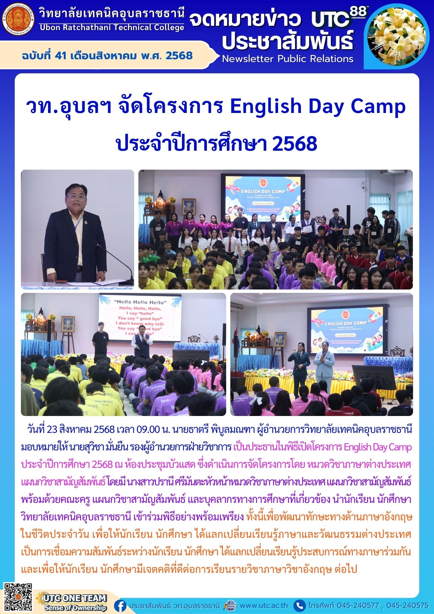 วันที่ 23 สิงหาคม 2568 เวลา 09.00 น. นายธาตรี พิบูลมณฑา ผู้อำนวยการวิทยาลัยเทคนิคอุบลราชธานีมอบหมายให้ นายสุวิชา มั่นยืน รองผู้อำนวยการฝ่ายวิชาการ เป็นประธานในพิธีเปิดโครงการ English Day Camp ประจำปีการศึกษา 2568 ณ ห้องประชุมบัวแสด ซึ่งดำเนินการจัดโครงการโดย หมวดวิชาภาษาต่างประเทศ แผนกวิชาสามัญสัมพันธ์ โดยมี นางสาวปรานี ศรีมันตะหัวหน้าหมวดวิชาภาษาต่างประเทศ แผนกวิชาสามัญสัมพันธ์ พร้อมด้วยคณะครู แผนกวิชาสามัญสัมพันธ์ และบุคลากรทางการศึกษาที่เกี่ยวข้อง นำนักเรียน นักศึกษา วิทยาลัยเทคนิคอุบลราชธานี เข้าร่วมพิธีอย่างพร้อมเพรียงทั้งนี้เพื่อพัฒนาทักษะทางด้านภาษาอังกฤษ ในชีวิตประจำวัน เพื่อให้นักเรียน นักศึกษา ได้แลกเปลี่ยนเรียนรู้ภาษาและวัฒนธรรมต่างประเทศเป็นการเชื่อมความสัมพันธ์ระหว่างนักเรียน นักศึกษา ได้แลกเปลี่ยนเรียนรู้ประสบการณ์ทางภาษาร่วมกัน และเพื่อให้นักเรียน นักศึกษามีเจตคติที่ดีต่อการเรียนรายวิชาภาษาวิชาอังกฤษ ต่อไป