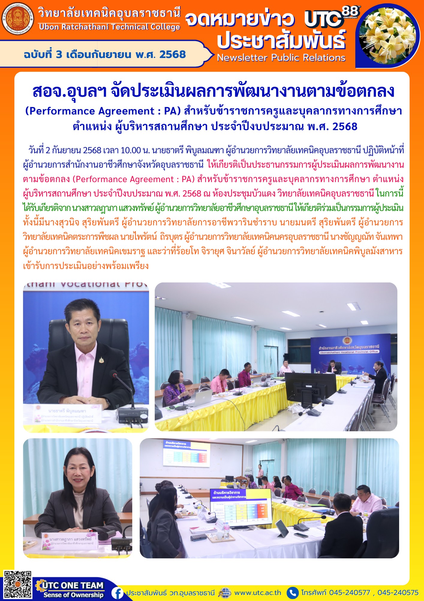 วันที่ 2 กันยายน 2568 เวลา 10.00 น. นายธาตรี พิบูลมณฑา ผู้อำนวยการวิทยาลัยเทคนิคอุบลราชธานี ปฏิบัติหน้าที่ ผู้อำนวยการสำนักงานอาชีวศึกษาจังหวัดอุบลราชธานี ให้เกียรติเป็นประธานกรรมการผู้ประเมินผลการพัฒนางานตามข้อตกลง (Performance Agreement : PA) สำหรับข้าราชการครูและบุคลากรทางการศึกษา ตำแหน่ง ผู้บริหารสถานศึกษา ประจำปีงบประมาณ พ.ศ. 2568 ณ ห้องประชุมบัวแดง วิทยาลัยเทคนิคอุบลราชธานี ในการนี้ได้รับเกียรติจาก นางสาวลฎาภา แสวงทรัพย์ ผู้อำนวยการวิทยาลัยอาชีวศึกษาอุบลราชธานี ให้เกียรติร่วมเป็นกรรมการผู้ประเมิน ทั้งนี้มีนางสุวนิจ สุริยพันตรี ผู้อำนวยการวิทยาลัยการอาชีพวารินชำราบ นายมนตรี สุริยพันตรี ผู้อำนวยการวิทยาลัยเทคนิคตระการพืชผล นายไพรัตน์ ถิรบุตร ผู้อำนวยการวิทยาลัยเทคนิคนครอุบลราชธานี นางชัญญณัท จันเทพา ผู้อำนวยการวิทยาลัยเทคนิคเขมราฐ และว่าที่ร้อยโท จิรายุศ จินาวัลย์ ผู้อำนวยการวิทยาลัยเทคนิคพิบูลมังสาหาร เข้ารับการประเมินอย่างพร้อมเพรียง