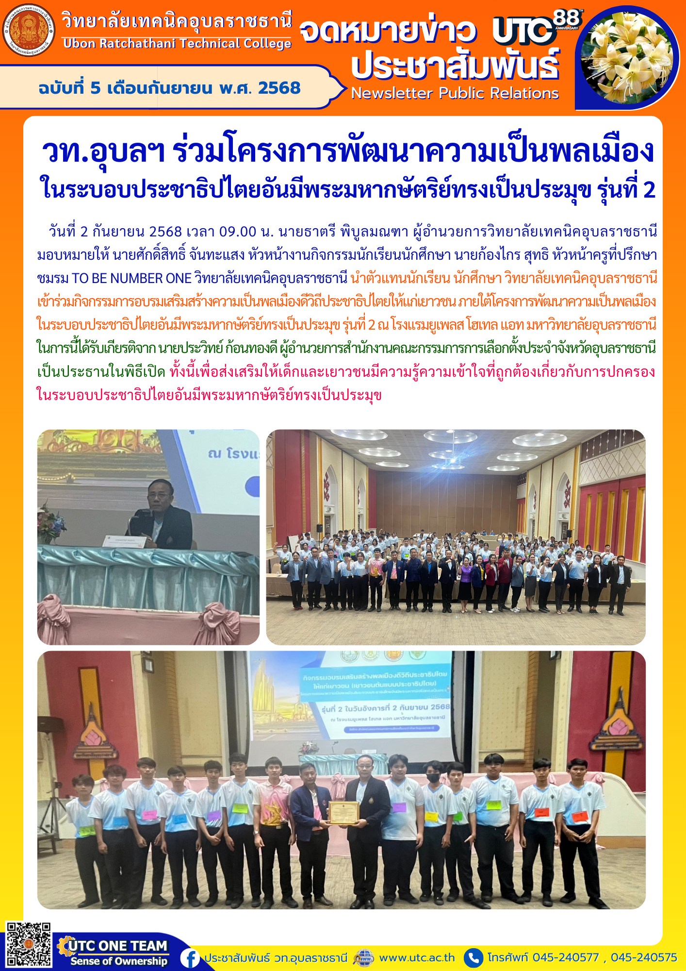 วันที่ 2 กันยายน 2568 เวลา 09.00 น. นายธาตรี พิบูลมณฑา ผู้อำนวยการวิทยาลัยเทคนิคอุบลราชธานี มอบหมายให้ นายศักดิ์สิทธิ์ จันทะแสง หัวหน้างานกิจกรรมนักเรียนนักศึกษา นายก้องไกร สุทธิ หัวหน้าครูที่ปรึกษาชมรม TO BE NUMBER ONE วิทยาลัยเทคนิคอุบลราชธานี นำตัวแทนนักเรียน นักศึกษา วิทยาลัยเทคนิคอุบลราชธานี เข้าร่วมกิจกรรมการอบรมเสริมสร้างความเป็นพลเมืองดีวิถีประชาธิปไตยให้แก่เยาวชน ภายใต้โครงการพัฒนาความเป็นพลเมืองในระบอบประชาธิปไตยอันมีพระมหากษัตริย์ทรงเป็นประมุข รุ่นที่ 2 ณ โรงแรมยูเพลส โฮเทล แอท มหาวิทยาลัยอุบลราชธานี ในการนี้ได้รับเกียรติจาก นายประวิทย์ ก้อนทองดี ผู้อำนวยการสำนักงานคณะกรรมการการเลือกตั้งประจำจังหวัดอุบลราชธานี ทั้งนี้เพื่อส่งเสริมให้เด็กและเยาวชนมีความรู้ความเข้าใจที่ถูกต้องเกี่ยวกับการปกครองในระบอบประชาธิปไตยอันมีพระมหากษัตริย์ทรงเป็นประมุข