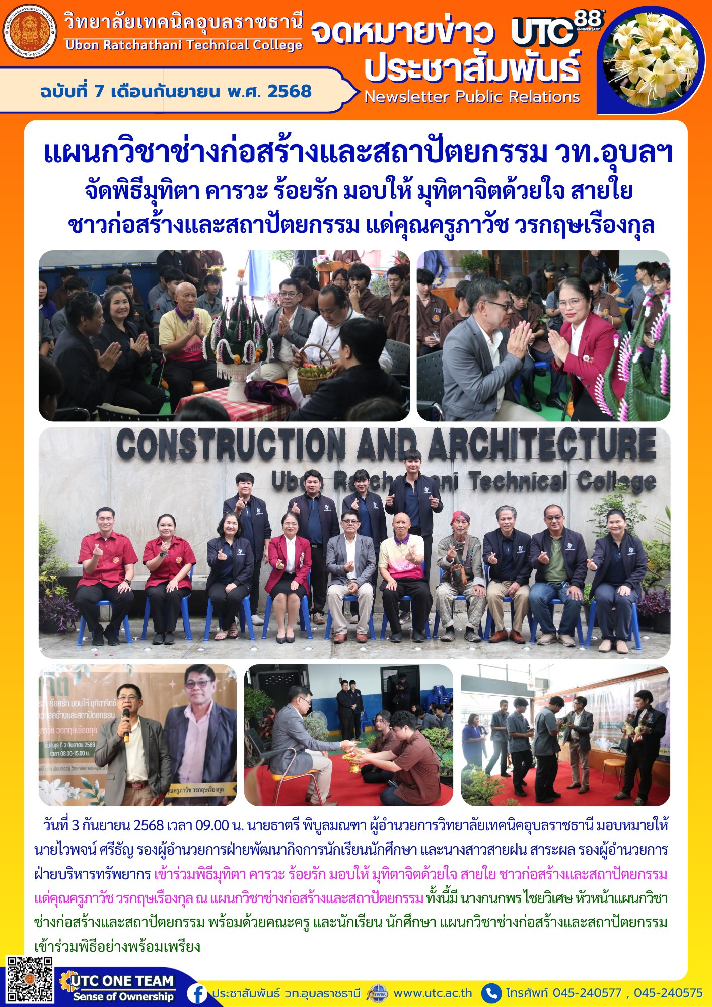 วันที่ 3 กันยายน 2568 เวลา 09.00 น. นายธาตรี พิบูลมณฑา ผู้อำนวยการวิทยาลัยเทคนิคอุบลราชธานี มอบหมายให้ นายไวพจน์ ศรีธัญ รองผู้อำนวยการฝ่ายพัฒนากิจการนักเรียนนักศึกษา และนางสาวสายฝน สาระผล รองผู้อำนวยการฝ่ายบริหารทรัพยากร เข้าร่วมพิธีมุทิตา คารวะ ร้อยรัก มอบให้ มุทิตาจิตด้วยใจ สายใย ชาวก่อสร้างและสถาปัตยกรรม แด่คุณครูภาวัช วรกฤษเรืองกุล ณ แผนกวิชาช่างก่อสร้างและสถาปัตยกรรม ทั้งนี้มี นางกนกพร ไชยวิเศษ หัวหน้าแผนกวิชาช่างก่อสร้างและสถาปัตยกรรม พร้อมด้วยคณะครู และนักเรียน นักศึกษา แผนกวิชาช่างก่อสร้างและสถาปัตยกรรม เข้าร่วมพิธีอย่างพร้อมเพรียง