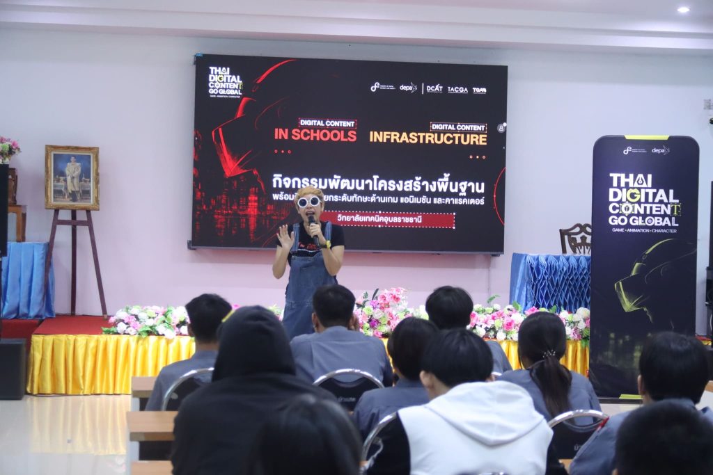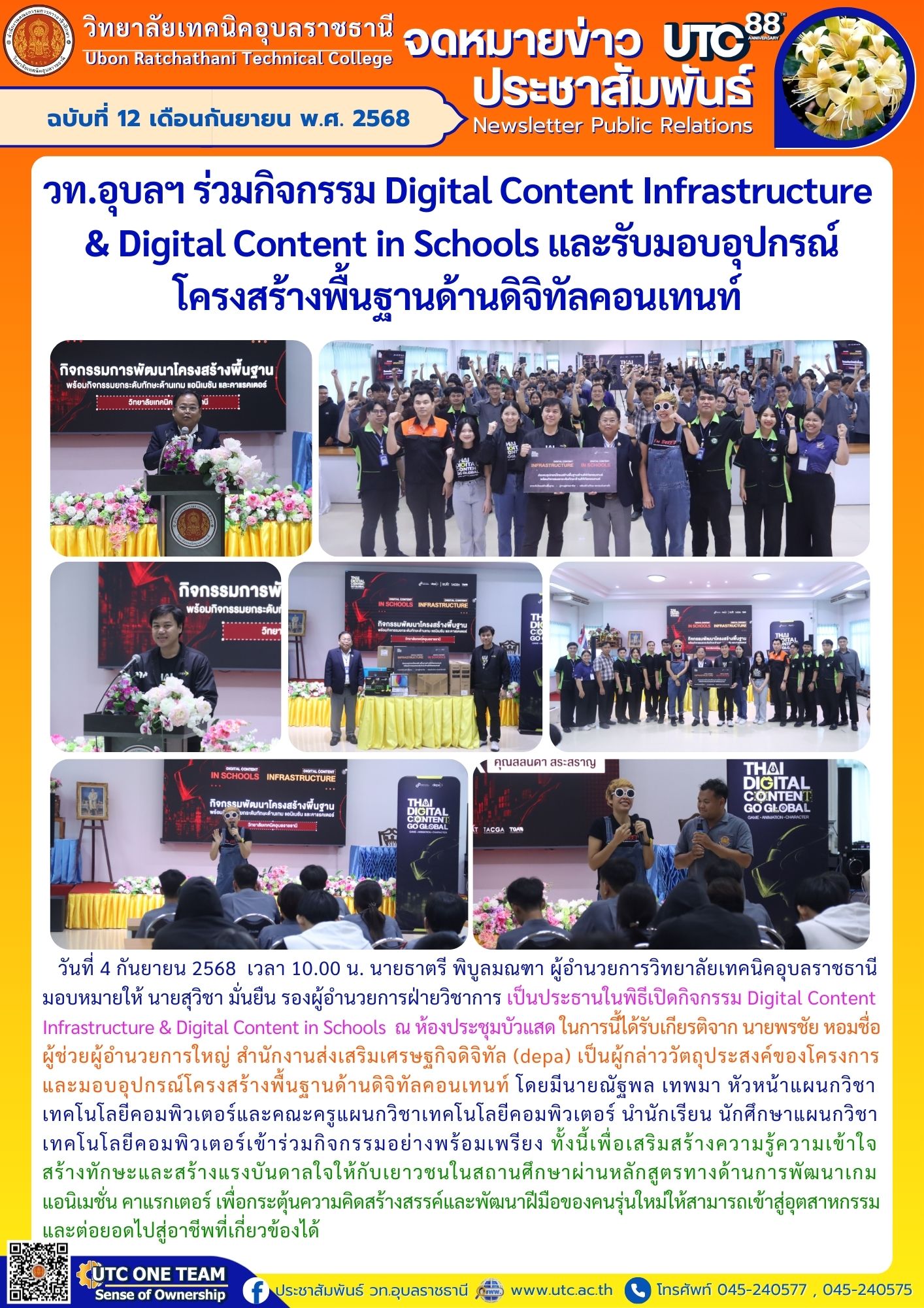 วันที่ 4 กันยายน 2568 เวลา 10.00 น. นายธาตรี พิบูลมณฑา ผู้อำนวยการวิทยาลัยเทคนิคอุบลราชธานี มอบหมายให้ นายสุวิชา มั่นยืน รองผู้อำนวยการฝ่ายวิชาการ เป็นประธานในพิธีเปิดกิจกรรม Digital Content Infrastructure & Digital Content in Schools ณ ห้องประชุมบัวแสด ในการนี้ได้รับเกียรติจาก นายพรชัย หอมชื่อ ผู้ช่วยผู้อำนวยการใหญ่ สำนักงานส่งเสริมเศรษฐกิจดิจิทัล (depa) เป็นผู้กล่าววัตถุประสงค์ของโครงการและมอบอุปกรณ์โครงสร้างพื้นฐานด้านดิจิทัลคอนเทนท์ โดยมีนายณัฐพล เทพมา หัวหน้าแผนกวิชาเทคโนโลยีคอมพิวเตอร์และคณะครูแผนกวิชาเทคโนโลยีคอมพิวเตอร์ นำนักเรียน นักศึกษาแผนกวิชาเทคโนโลยีคอมพิวเตอร์เข้าร่วมกิจกรรมอย่างพร้อมเพรียง ทั้งนี้เพื่อเสริมสร้างความรู้ความเข้าใจ สร้างทักษะและสร้างแรงบันดาลใจให้กับเยาวชนในสถานศึกษาผ่านหลักสูตรทางด้านการพัฒนาเกม แอนิเมชั่น คาแรกเตอร์ เพื่อกระตุ้นความคิดสร้างสรรค์และพัฒนาฝีมือของคนรุ่นใหม่ให้สามารถเข้าสู่อุตสาหกรรม