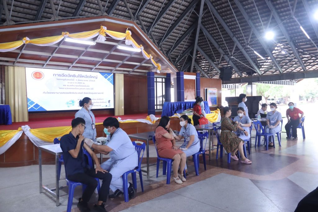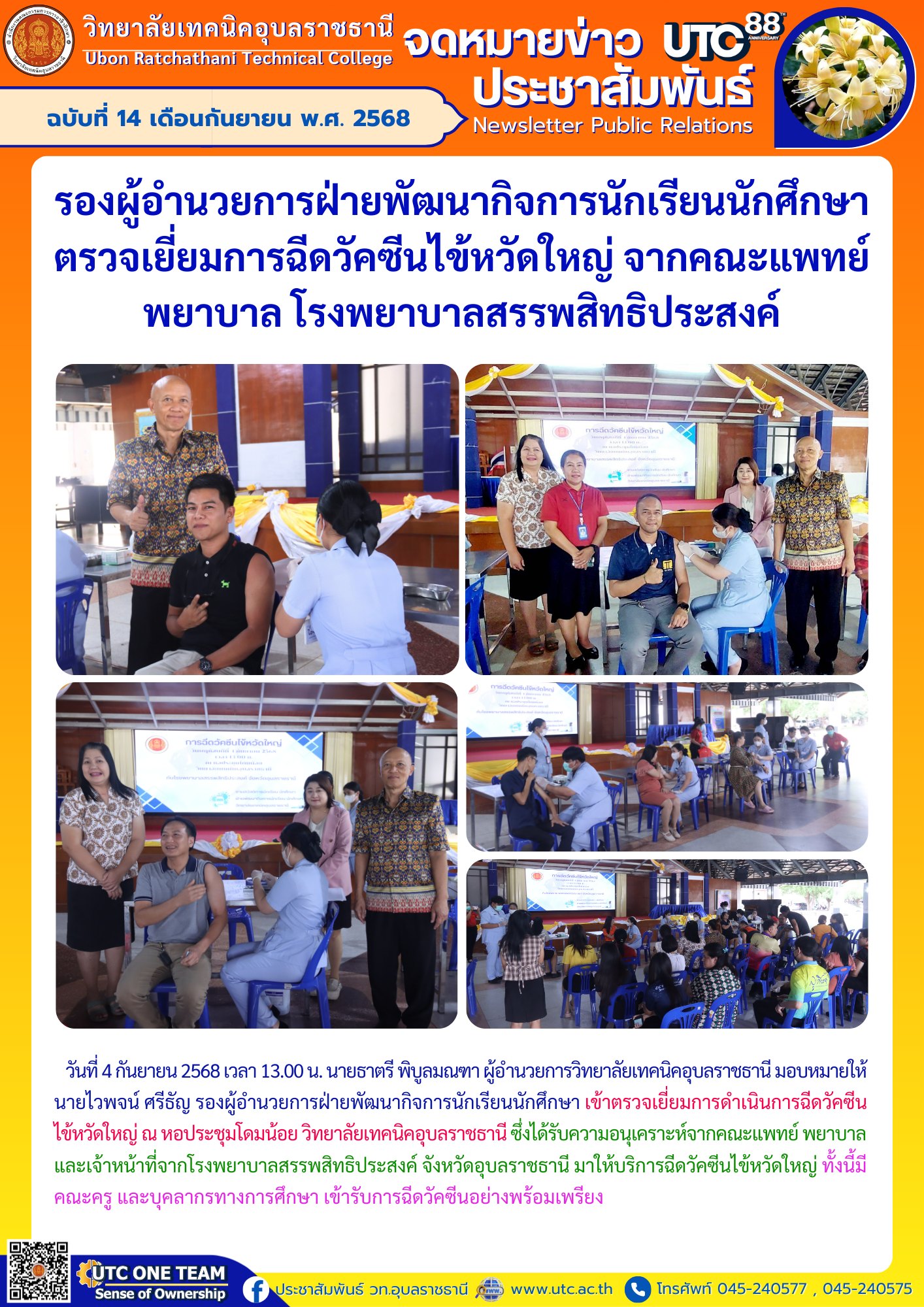 วันที่ 4 กันยายน 2568 เวลา 13.00 น. นายธาตรี พิบูลมณฑา ผู้อำนวยการวิทยาลัยเทคนิคอุบลราชธานี มอบหมายให้ นายไวพจน์ ศรีธัญ รองผู้อำนวยการฝ่ายพัฒนากิจการนักเรียนนักศึกษา เข้าตรวจเยี่ยมการดำเนินการฉีดวัคซีนไข้หวัดใหญ่ ณ หอประชุมโดมน้อย วิทยาลัยเทคนิคอุบลราชธานี ซึ่งได้รับความอนุเคราะห์จากคณะแพทย์ พยาบาล และเจ้าหน้าที่จากโรงพยาบาลสรรพสิทธิประสงค์ จังหวัดอุบลราชธานี มาให้บริการฉีดวัคซีนไข้หวัดใหญ่ ทั้งนี้มีคณะครู และบุคลากรทางการศึกษา เข้ารับการฉีดวัคซีนอย่างพร้อมเพรียง
