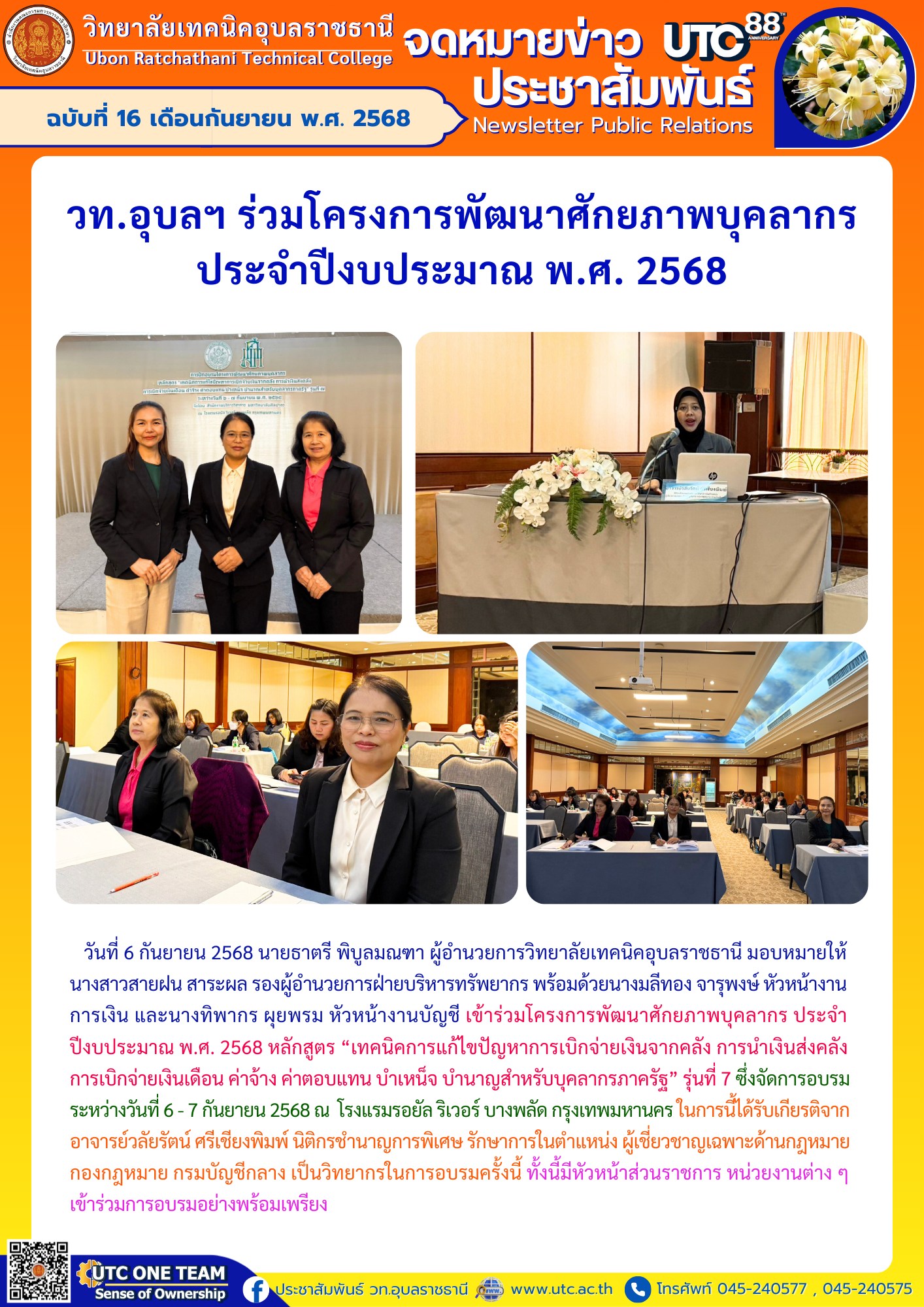 วันที่ 6 กันยายน 2568 นายธาตรี พิบูลมณฑา ผู้อำนวยการวิทยาลัยเทคนิคอุบลราชธานี มอบหมายให้ นางสาวสายฝน สาระผล รองผู้อำนวยการฝ่ายบริหารทรัพยากร พร้อมด้วยนางมลีทอง จารุพงษ์ หัวหน้างานการเงิน และนางทิพากร ผุยพรม หัวหน้างานบัญชี เข้าร่วมโครงการพัฒนาศักยภาพบุคลากร ประจำปีงบประมาณ พ.ศ. 2568 หลักสูตร “เทคนิคการแก้ไขปัญหาการเบิกจ่ายเงินจากคลัง การนำเงินส่งคลัง การเบิกจ่ายเงินเดือน ค่าจ้าง ค่าตอบแทน บำเหน็จ บำนาญสำหรับบุคลากรภาครัฐ” รุ่นที่ 7 ซึ่งจัดการอบรมระหว่างวันที่ 6 – 7 กันยายน 2568 ณ โรงแรมรอยัล ริเวอร์ บางพลัด กรุงเทพมหานคร ในการนี้ได้รับเกียรติจาก อาจารย์วลัยรัตน์ ศรีเชียงพิมพ์ นิติกรชำนาญการพิเศษ รักษาการในตำแหน่ง ผู้เชี่ยวชาญเฉพาะด้านกฎหมาย กองกฎหมาย กรมบัญชีกลาง เป็นวิทยากรในการอบรมครั้งนี้ ทั้งนี้มีหัวหน้าส่วนราชการ หน่วยงานต่างๆ เข้าร่วมการอบรมอย่างพร้อมเพรียง