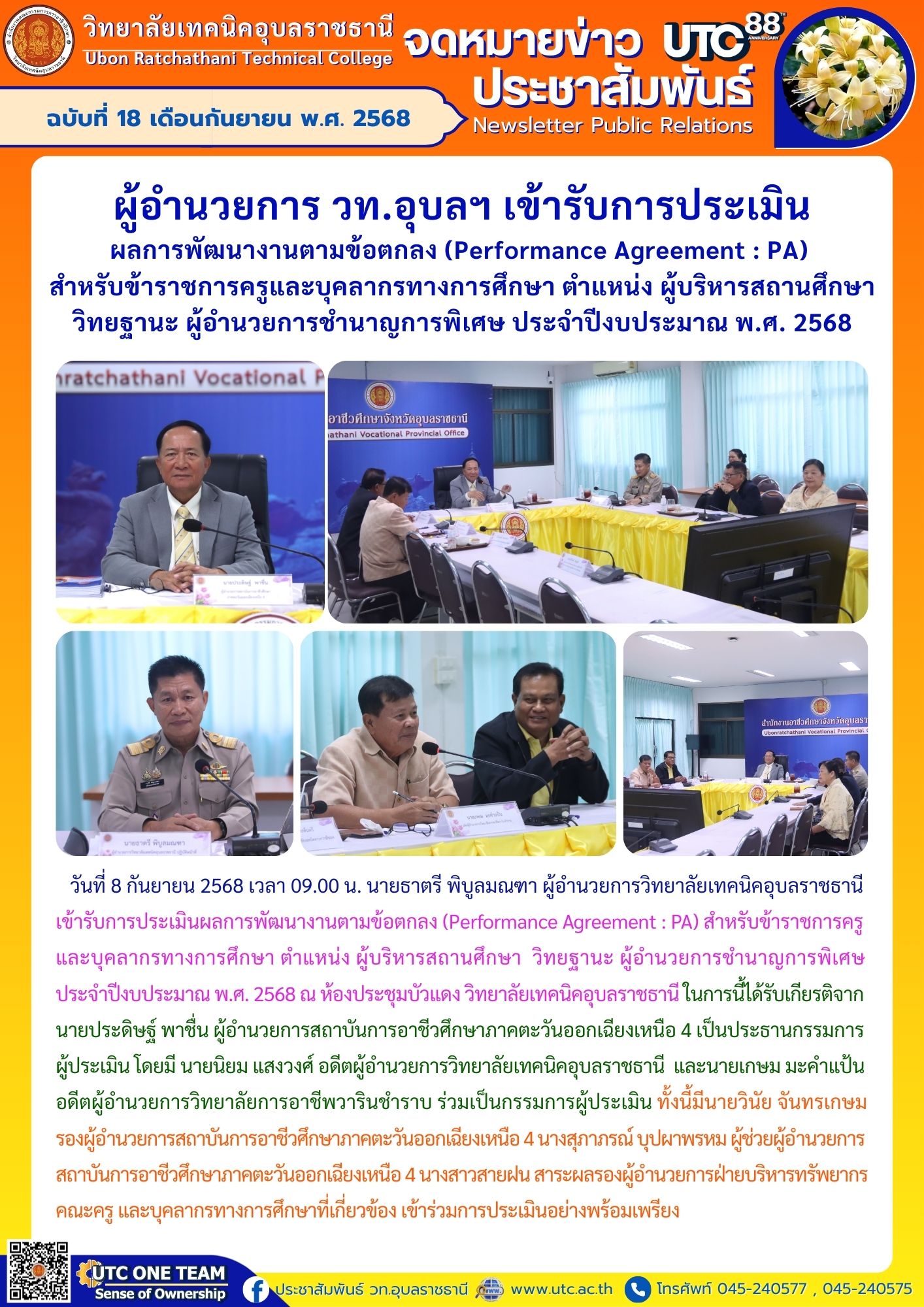 ผู้อำนวยการ วท.อุบลฯ เข้ารับการประเมินผลการพัฒนางานตามข้อตกลง (Performance Agreement : PA) สำหรับข้าราชการครู และบุคลากรทางการศึกษา ตำแหน่ง ผู้บริหารสถานศึกษา วิทยฐานะ ผู้อำนวยการชำนาญการพิเศษ ประจำปีงบประมาณ พ.ศ. 2568