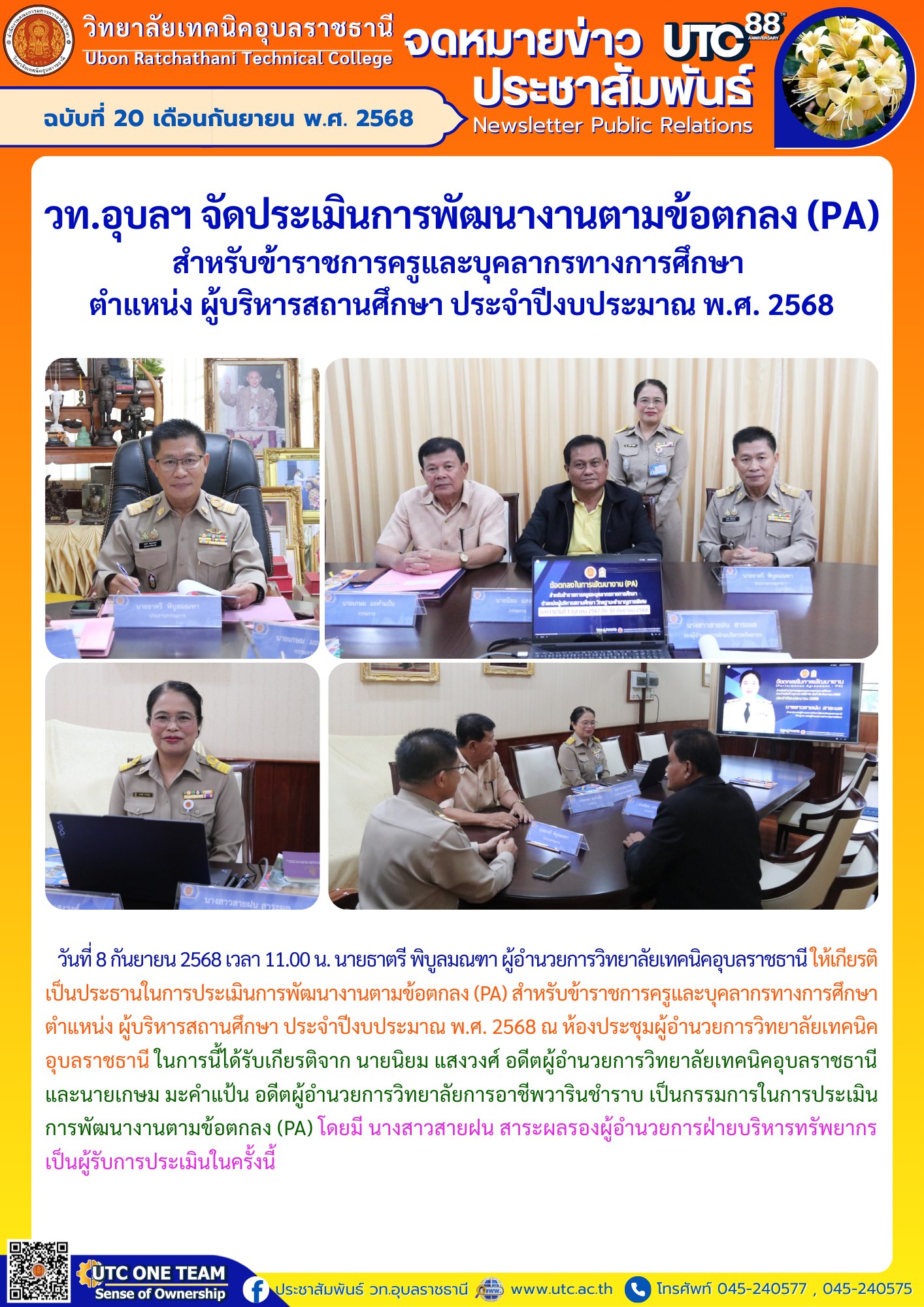 ผู้อำนวยการ วท.อุบลฯ เข้ารับการประเมินผลการพัฒนางานตามข้อตกลง (Performance Agreement : PA) สำหรับข้าราชการครู และบุคลากรทางการศึกษา ตำแหน่ง ผู้บริหารสถานศึกษา วิทยฐานะ ผู้อำนวยการชำนาญการพิเศษ ประจำปีงบประมาณ พ.ศ. 2568