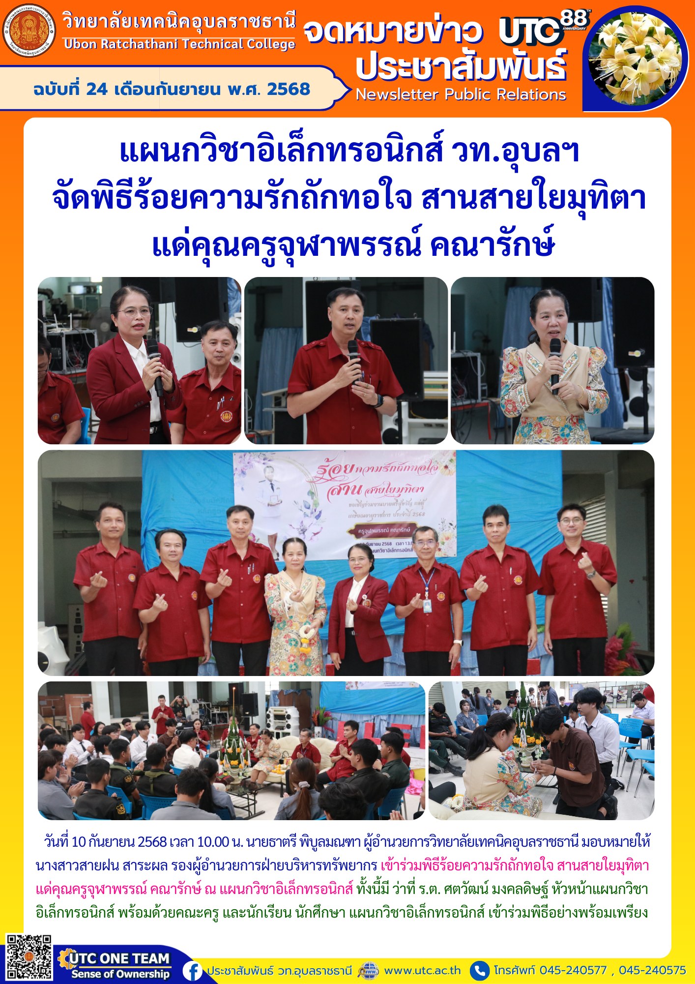 วันที่ 10 กันยายน 2568 เวลา 10.00 น. นายธาตรี พิบูลมณฑา ผู้อำนวยการวิทยาลัยเทคนิคอุบลราชธานี มอบหมายให้ นางสาวสายฝน สาระผล รองผู้อำนวยการฝ่ายบริหารทรัพยากร เข้าร่วมพิธีร้อยความรักถักทอใจ สานสายใยมุทิตา แด่คุณครูจุฬาพรรณ์ คณารักษ์ ณ แผนกวิชาอิเล็กทรอนิกส์ ทั้งนี้มี ว่าที่ ร.ต. ศตวัฒน์ มงคลดิษฐ์ หัวหน้าแผนกวิชาอิเล็กทรอนิกส์ พร้อมด้วยคณะครู และนักเรียน นักศึกษา แผนกวิชาอิเล็กทรอนิกส์ เข้าร่วมพิธีอย่างพร้อมเพรียง