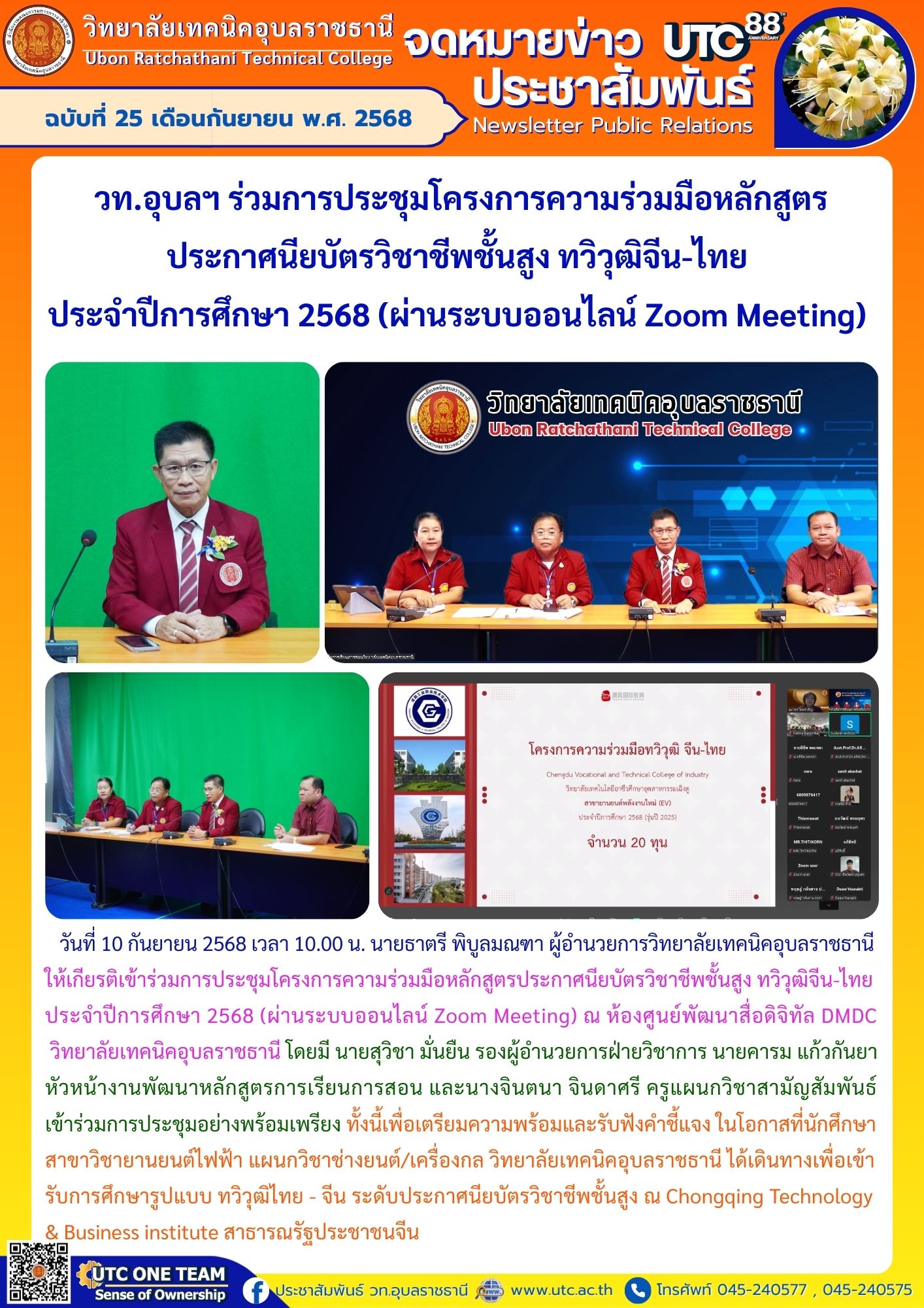 วท.อุบลฯ ร่วมการประชุมโครงการความร่วมมือหลักสูตรประกาศนียบัตรวิชาชีพชั้นสูง ทวิวุฒิจีน-ไทย ประจำปีการศึกษา 2568 (ผ่านระบบออนไลน์ Zoom Meeting)