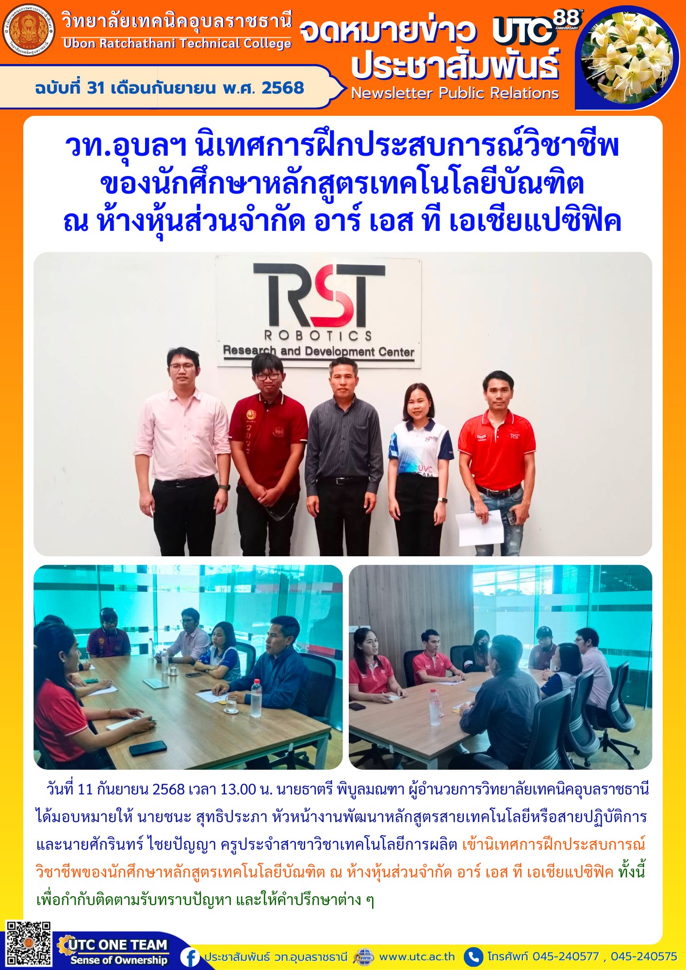 วันที่ 11 กันยายน 2568 เวลา 13.00 น. นายธาตรี พิบูลมณฑา ผู้อำนวยการวิทยาลัยเทคนิคอุบลราชธานี ได้มอบหมายให้ นายชนะ สุทธิประภา หัวหน้างานพัฒนาหลักสูตรสายเทคโนโลยีหรือสายปฏิบัติการและนายศักรินทร์ ไชยปัญญา ครูประจำสาขาวิชาเทคโนโลยีการผลิต เข้านิเทศการฝึกประสบการณ์วิชาชีพของนักศึกษาหลักสูตรเทคโนโลยีบัณฑิต ณ ห้างหุ้นส่วนจำกัด อาร์ เอส ที เอเชียแปซิฟิค ทั้งนี้เพื่อกำกับติดตามรับทราบปัญหา และให้คำปรึกษาต่าง ๆ