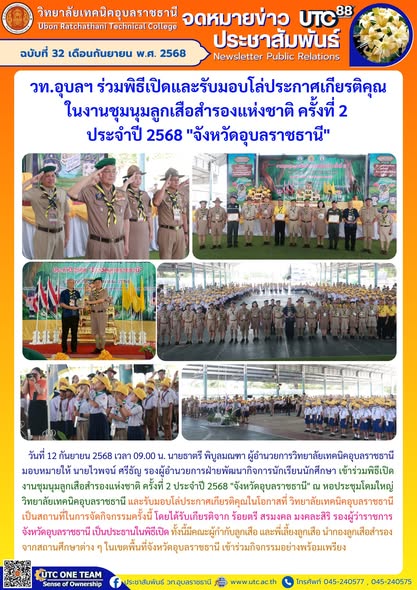 วันที่ 12 กันยายน 2568 เวลา 09.00 น. นายธาตรี พิบูลมณฑา ผู้อำนวยการวิทยาลัยเทคนิคอุบลราชธานี มอบหมายให้ นายไวพจน์ ศรีธัญ รองผู้อำนวยการฝ่ายพัฒนากิจการนักเรียนนักศึกษา เข้าร่วมพิธีเปิดงานชุมนุมลูกเสือสำรองแห่งชาติ ครั้งที่ 2 ประจำปี 2568 “จังหวัดอุบลราชธานี” ณ หอประชุมโดมใหญ่ วิทยาลัยเทคนิคอุบลราชธานี และรับมอบโล่ประกาศเกียรติคุณในโอกาสที่ วิทยาลัยเทคนิคอุบลราชธานี เป็นสถานที่ในการจัดกิจกรรมครั้งนี้ โดยได้รับเกียรติจาก ร้อยตรี สรมงคล มงคละสิริ รองผู้ว่าราชการจังหวัดอุบลราชธานี เป็นประธานในพิธีเปิด ทั้งนี้มีคณะผู้กำกับลูกเสือ และพี่เลี้ยงลูกเสือ นำกองลูกเสือสำรอง จากสถานศึกษาต่าง ๆ ในเขตพื้นที่จังหวัดอุบลราชธานี เข้าร่วมกิจกรรมอย่างพร้อมเพรียง