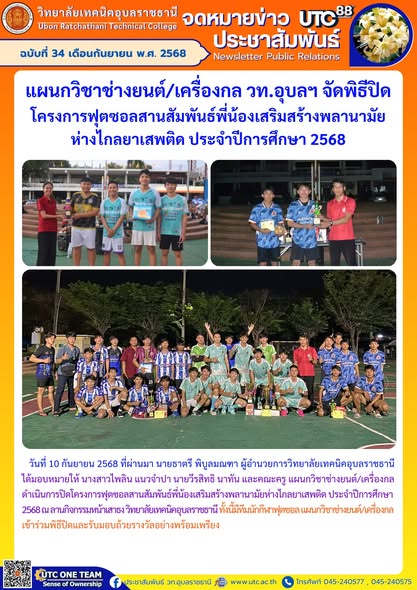 วันที่ 10 กันยายน 2568 ที่ผ่านมา นายธาตรี พิบูลมณฑา ผู้อำนวยการวิทยาลัยเทคนิคอุบลราชธานี ได้มอบหมายให้ นางสาวไพลิน แนวจำปา นายวีรสิทธิ นาทัน และคณะครู แผนกวิชาช่างยนต์/เครื่องกล ดำเนินการปิดโครงการฟุตซอลสานสัมพันธ์พี่น้องเสริมสร้างพลานามัยห่างไกลยาเสพติด ประจำปีการศึกษา 2568 ณ ลานกิจกรรมหน้าเสาธง วิทยาลัยเทคนิคอุบลราชธานี ทั้งนี้มีทีมนักกีฬาฟุตซอล แผนกวิชาช่างยนต์/เครื่องกล เข้าร่วมพิธีปิดและรับมอบถ้วยรางวัลอย่างพร้อมเพรียง
