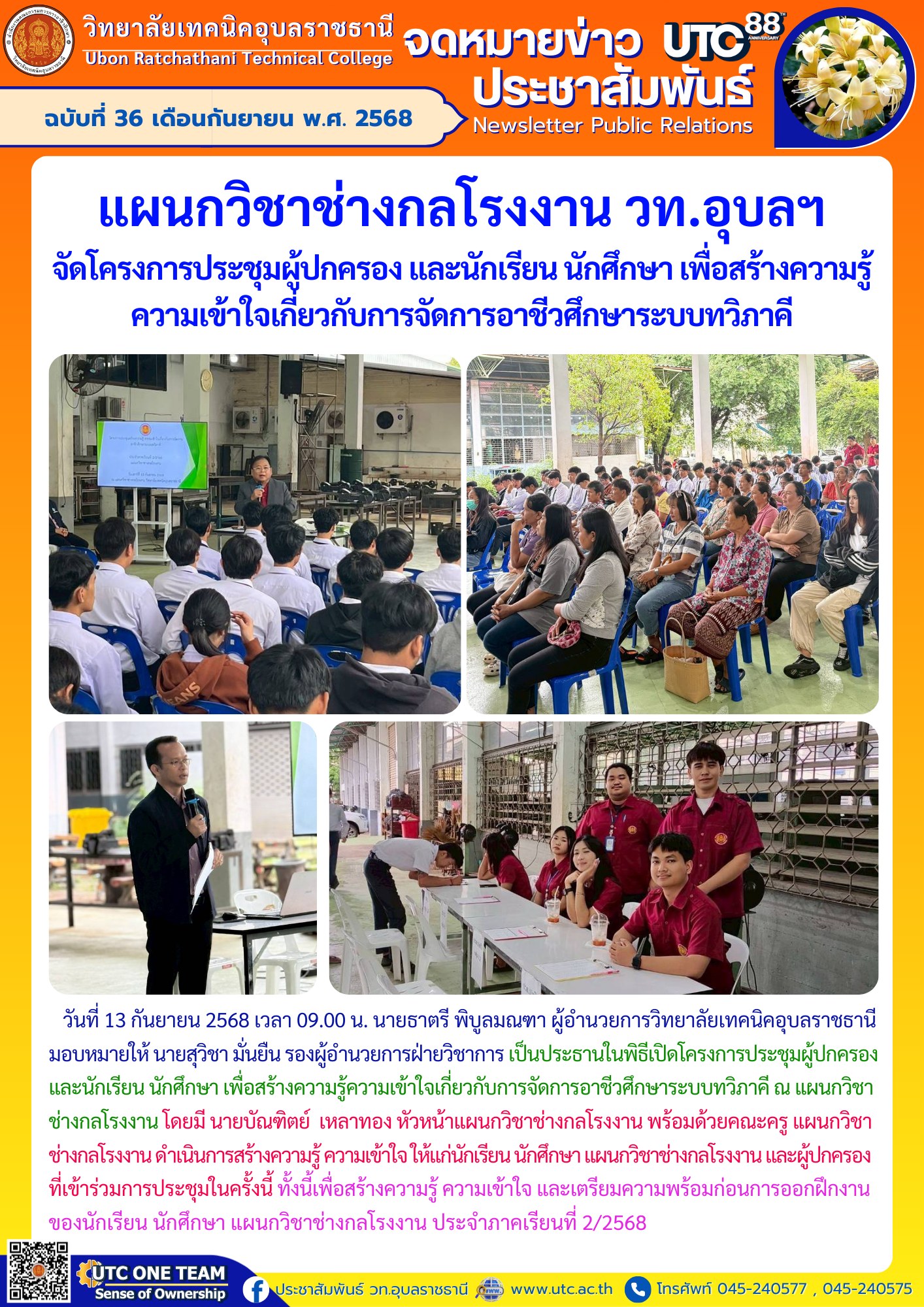 แผนกวิชาช่างกลโรงงาน วท.อุบลฯ จัดโครงการประชุมผู้ปกครอง และนักเรียน นักศึกษา เพื่อสร้างความรู้ความเข้าใจเกี่ยวกับการจัดการอาชีวศึกษาระบบทวิภาคี