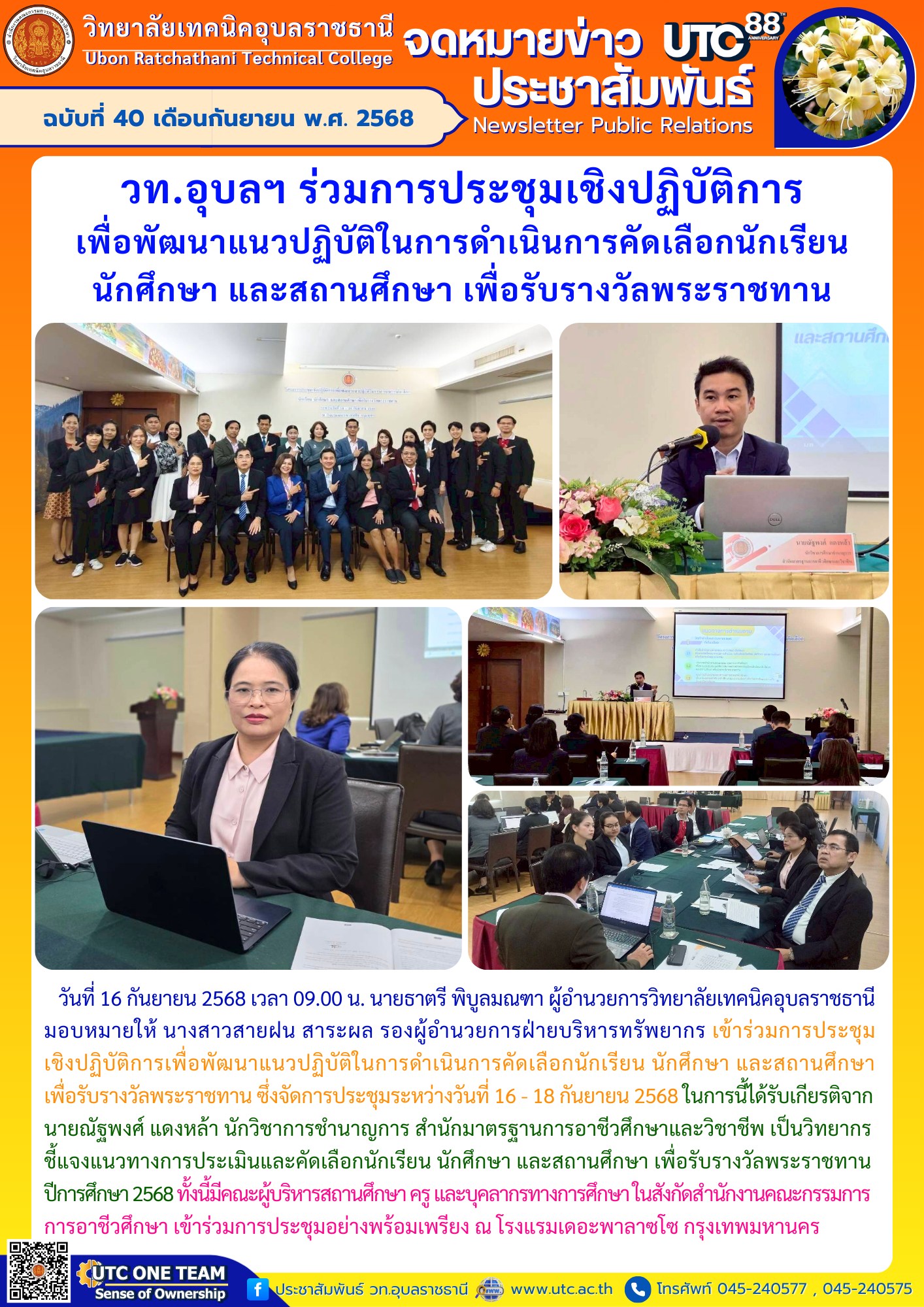 วันที่ 16 กันยายน 2568 เวลา 09.00 น. นายธาตรี พิบูลมณฑา ผู้อำนวยการวิทยาลัยเทคนิคอุบลราชธานี มอบหมายให้ นางสาวสายฝน สาระผล รองผู้อำนวยการฝ่ายบริหารทรัพยากร เข้าร่วมการประชุมเชิงปฏิบัติการเพื่อพัฒนาแนวปฏิบัติในการดำเนินการคัดเลือกนักเรียน นักศึกษา และสถานศึกษา เพื่อรับรางวัลพระราชทาน ซึ่งจัดการประชุมระหว่างวันที่ 16 – 18 กันยายน 2568 ในการนี้ได้รับเกียรติจาก นายณัฐพงศ์ แดงหล้า นักวิชาการชำนาญการ สำนักมาตรฐานการอาชีวศึกษาและวิชาชีพ เป็นวิทยากรชี้แจงแนวทางการประเมินและคัดเลือกนักเรียน นักศึกษา และสถานศึกษา เพื่อรับรางวัลพระราชทาน ปีการศึกษา 2568 ทั้งนี้มีคณะผู้บริหารสถานศึกษา ครู และบุคลากรทางการศึกษา ในสังกัดสำนักงานคณะกรรมการการอาชีวศึกษา เข้าร่วมการประชุมอย่างพร้อมเพรียง ณ โรงแรมเดอะพาลาซโซ กรุงเทพมหานคร
