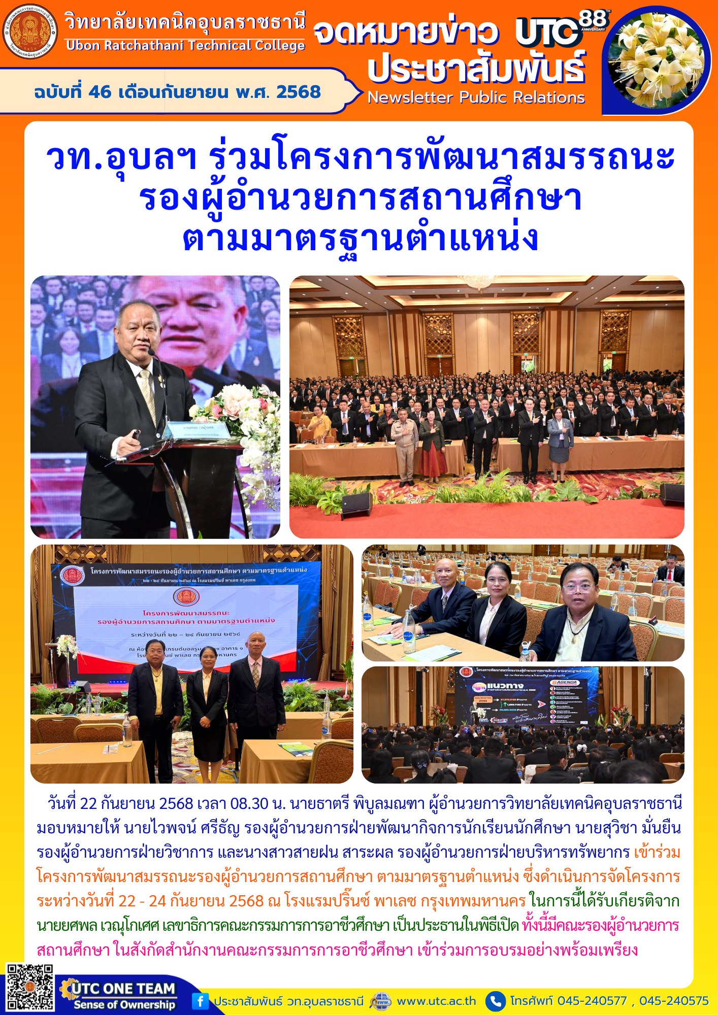 วันที่ 22 กันยายน 2568 เวลา 08.30 น. นายธาตรี พิบูลมณฑา ผู้อำนวยการวิทยาลัยเทคนิคอุบลราชธานี มอบหมายให้ นายไวพจน์ ศรีธัญ รองผู้อำนวยการฝ่ายพัฒนากิจการนักเรียนนักศึกษา นายสุวิชา มั่นยืน รองผู้อำนวยการฝ่ายวิชาการ และนางสาวสายฝน สาระผล รองผู้อำนวยการฝ่ายบริหารทรัพยากร เข้าร่วมโครงการพัฒนาสมรรถนะรองผู้อำนวยการสถานศึกษา ตามมาตรฐานตำแหน่ง ซึ่งดำเนินการจัดโครงการระหว่างวันที่ 22 – 24 กันยายน 2568 ณ โรงแรมปริ๊นซ์ พาเลซ กรุงเทพมหานคร ในการนี้ได้รับเกียรติจาก นายยศพล เวณุโกเศศ เลขาธิการคณะกรรมการการอาชีวศึกษา เป็นประธานในพิธีเปิด ทั้งนี้มีคณะรองผู้อำนวยการสถานศึกษา ในสังกัดสำนักงานคณะกรรมการการอาชีวศึกษา เข้าร่วมการอบรมอย่างพร้อมเพรียง