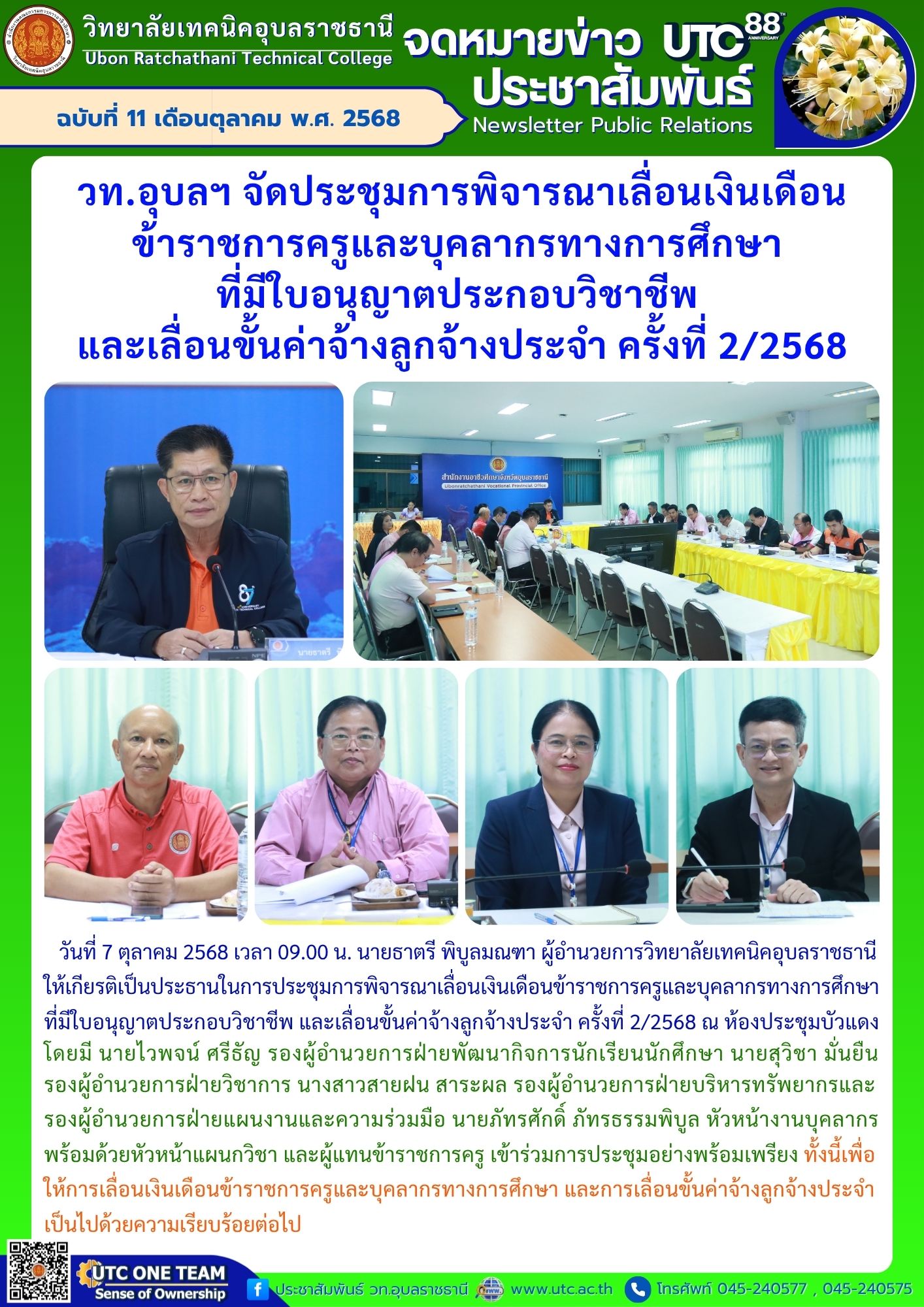วันที่ 7 ตุลาคม 2568 เวลา 09.00 น. นายธาตรี พิบูลมณฑา ผู้อำนวยการวิทยาลัยเทคนิคอุบลราชธานี ให้เกียรติเป็นประธานในการประชุมการพิจารณาเลื่อนเงินเดือนข้าราชการครูและบุคลากรทางการศึกษา ที่มีใบอนุญาตประกอบวิชาชีพ และเลื่อนขั้นค่าจ้างลูกจ้างประจำ ครั้งที่ 2/2568 ณ ห้องประชุมบัวแดง โดยมี นายไวพจน์ ศรีธัญ รองผู้อำนวยการฝ่ายพัฒนากิจการนักเรียนนักศึกษา นายสุวิชา มั่นยืน รองผู้อำนวยการฝ่ายวิชาการ นางสาวสายฝน สาระผล รองผู้อำนวยการฝ่ายบริหารทรัพยากรและรองผู้อำนวยการฝ่ายแผนงานและความร่วมมือ นายภัทรศักดิ์ ภัทรธรรมพิบูล หัวหน้างานบุคลากร พร้อมด้วยหัวหน้าแผนกวิชา และผู้แทนข้าราชการครู เข้าร่วมการประชุมอย่างพร้อมเพรียง ทั้งนี้เพื่อให้การเลื่อนเงินเดือนข้าราชการครูและบุคลากรทางการศึกษา และการเลื่อนขั้นค่าจ้างลูกจ้างประจำเป็นไปด้วยความเรียบร้อยต่อไป