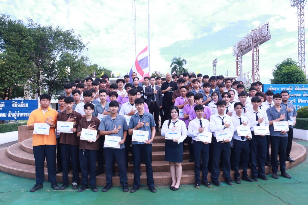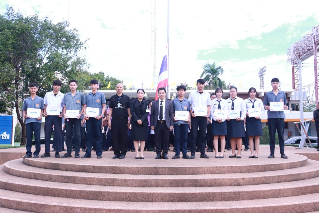 วันที่ 4 พฤศจิกายน 2568 เวลา 07.30 น. นายธาตรี พิบูลมณฑา ผู้อำนวยการวิทยาลัยเทคนิคอุบลราชธานี ให้เกียรติเป็นประธานในพิธีมอบเกียรติบัตรให้แก่นักเรียน นักศึกษา ที่เข้าร่วมกิจกรรมเข้าแถวหน้าเสาธง โดยมีสถิติการเข้าร่วมครบถ้วน 100% ในภาคเรียนที่ 1 ปีการศึกษา 2568 ที่ผ่านมา จำนวน 78 คน โดยมี นายไวพจน์ ศรีธัญ รองผู้อำนวยการฝ่ายพัฒนากิจการนักเรียนนักศึกษา กล่าวให้โอวาทแก่นักเรียน นักศึกษา ณ ลานกิจกรรมหน้าเสาธง โดยได้ประชาสัมพันธ์กิจกรรมและข้อมูลข่าวสารต่าง ๆ พร้อมได้เน้นย้ำในเรื่องการรักษาความสะอาดในเขตพื้นที่ของวิทยาลัยเทคนิคอุบลราชธานี ให้นักเรียน นักศึกษาได้รับทราบ ทั้งนี้มี นางสาวสายฝน สาระผล รองผู้อำนวยการฝ่ายบริหารทรัพยากรและรองผู้อำนวยการฝ่ายแผนงานและความร่วมมือ นำคณะครู บุคลากรทางการศึกษา และนักเรียน นักศึกษา เข้าร่วมกิจกรรมหน้าเสาธงอย่างพร้อมเพรียง