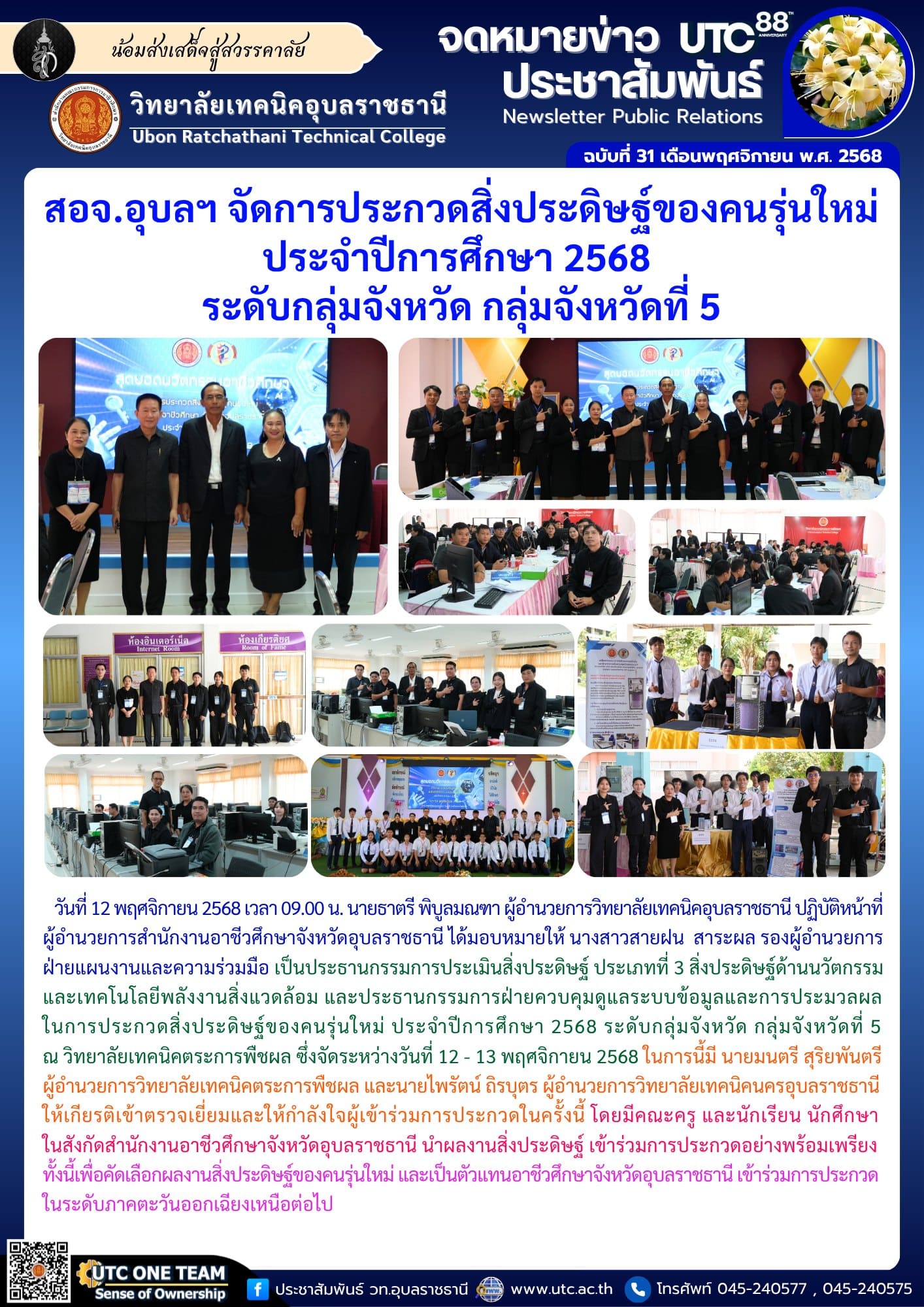 สอจ.อุบลฯ จัดการประกวดสิ่งประดิษฐ์ของคนรุ่นใหม่ ประจำปีการศึกษา 2568 ระดับกลุ่มจังหวัด กลุ่มจังหวัดที่ 5
