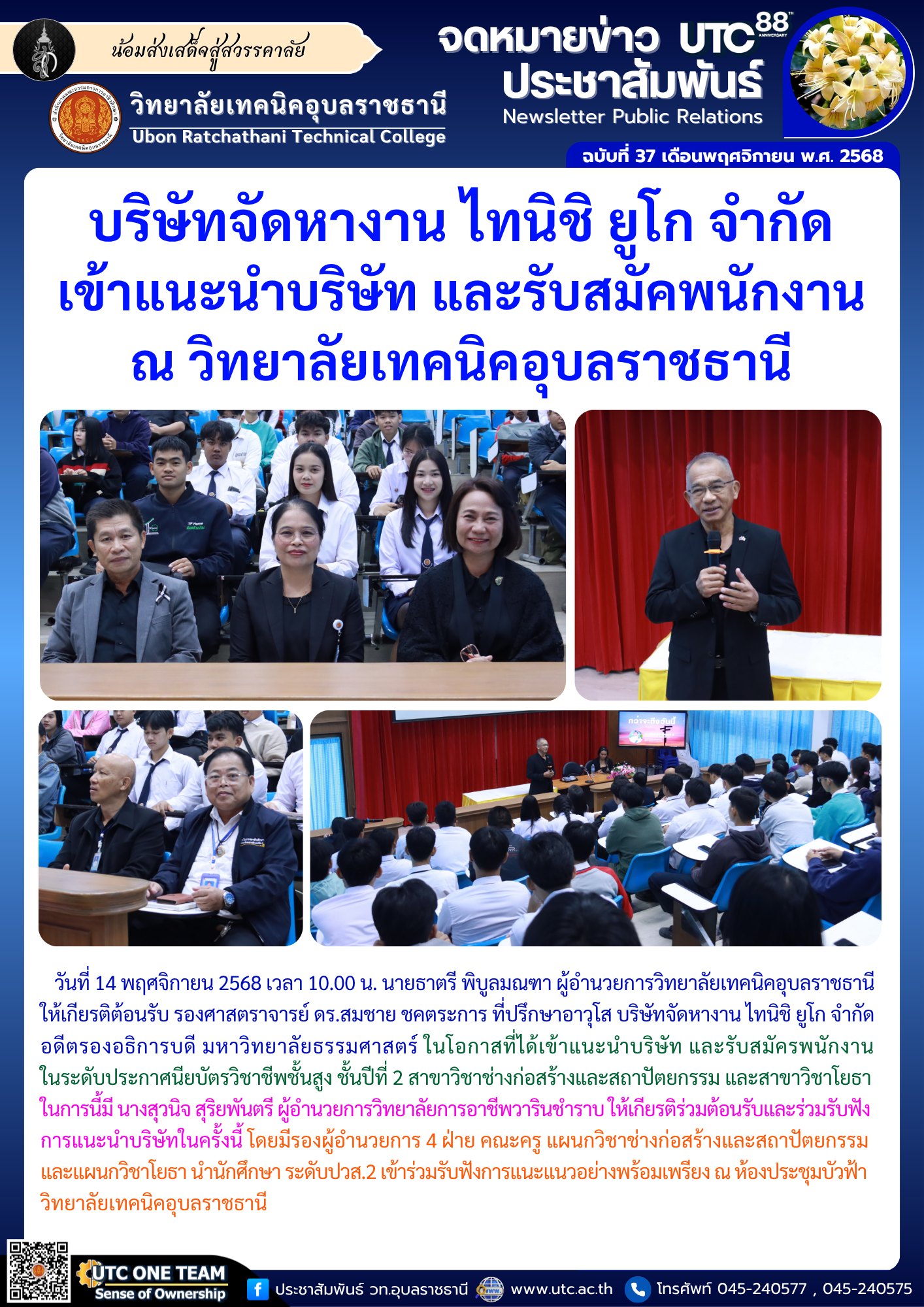 FacebookTwitterLineวันที่ 20 พฤศจิกายน 2568 เวลา 10.30 น. นายธาตรี พิบูลมณฑา ผู้อำนวยการวิทยาลัยเทคนิคอุบลราชธานี ปฏิบัติหน้าที่ ผู้อำนวยการสำนักงานอาชีวศึกษาจังหวัดอุบลราชธานี มอบหมายให้ นางสาวสายฝน (เพิ่มเติม…)