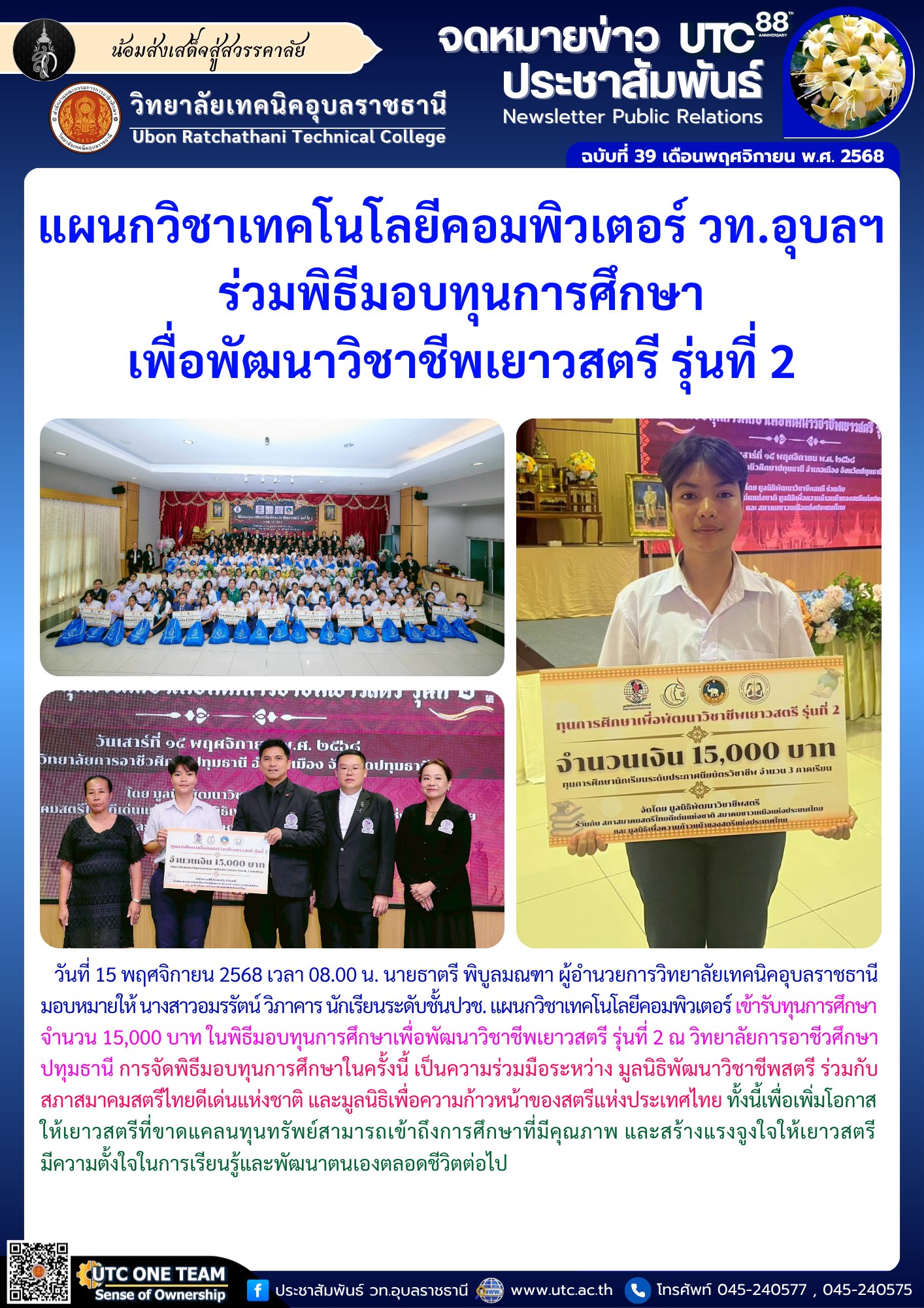 วันที่ 15 พฤศจิกายน 2568 เวลา 08.00 น. นายธาตรี พิบูลมณฑา ผู้อำนวยการวิทยาลัยเทคนิคอุบลราชธานี มอบหมายให้ นางสาวอมรรัตน์ วิภาคาร นักเรียนระดับชั้นปวช. แผนกวิชาเทคโนโลยีคอมพิวเตอร์เข้ารับทุนการศึกษา จำนวน 15,000 บาท ในพิธีมอบทุนการศึกษาเพื่อพัฒนาวิชาชีพเยาวสตรี รุ่นที่ 2 ณ วิทยาลัยการอาชีวศึกษาปทุมธานี การจัดพิธีมอบทุนการศึกษาในครั้งนี้ เป็นความร่วมมือระหว่าง มูลนิธิพัฒนาวิชาชีพสตรี ร่วมกับสภาสมาคมสตรีไทยดีเด่นแห่งชาติ และมูลนิธิเพื่อความก้าวหน้าของสตรีแห่งประเทศไทย ทั้งนี้เพื่อเพิ่มโอกาสให้เยาวสตรีที่ขาดแคลนทุนทรัพย์สามารถเข้าถึงการศึกษาที่มีคุณภาพ และสร้างแรงจูงใจให้เยาวสตรีมีความตั้งใจในการเรียนรู้และพัฒนาตนเองตลอดชีวิตต่อไป