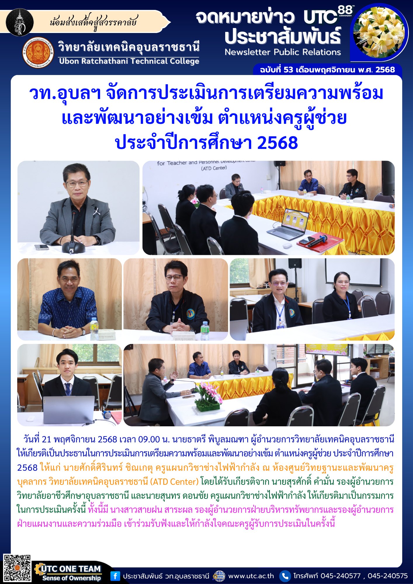 วันที่ 21 พฤศจิกายน 2568 เวลา 09.00 น. นายธาตรี พิบูลมณฑา ผู้อำนวยการวิทยาลัยเทคนิคอุบลราชธานี ให้เกียรติเป็นประธานในการประเมินการเตรียมความพร้อมและพัฒนาอย่างเข้ม ตำแหน่งครูผู้ช่วย ประจำปีการศึกษา 2568 ให้แก่ นายศักดิ์ศิรินทร์ ชิณเกตุ ครูแผนกวิชาช่างไฟฟ้ากำลัง ณ ห้องศูนย์วิทยฐานะและพัฒนาครู บุคลากร วิทยาลัยเทคนิคอุบลราชธานี (ATD Center) โดยได้รับเกียรติจาก นายสุรศักดิ์ คำมั่น รองผู้อำนวยการวิทยาลัยอาชีวศึกษาอุบลราชธานี และนายสุนทร ดอนชัย ครูแผนกวิชาช่างไฟฟ้ากำลัง ให้เกียรติมาเป็นกรรมการในการประเมินครั้งนี้ ทั้งนี้มี นางสาวสายฝน สาระผล รองผู้อำนวยการฝ่ายบริหารทรัพยากรและรองผู้อำนวยการฝ่ายแผนงานและความร่วมมือ เข้าร่วมรับฟังและให้กำลังใจคณะครูผู้รับการประเมินในครั้งนี้