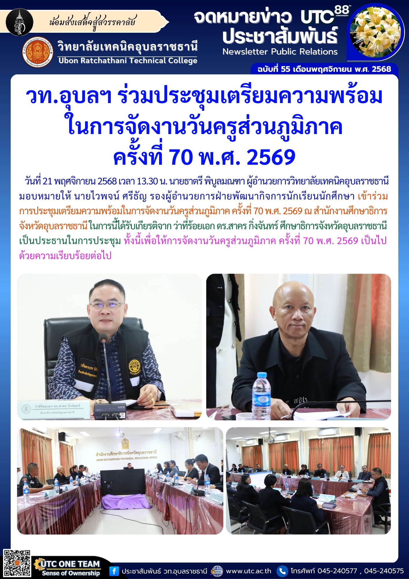 FacebookTwitterLineวันที่ 13 มีนาคม 2568 นายธาตรี พิบูลมณฑา ผู้อำนวยการวิทยาลัยเทคนิคอุบลราชธานี มอบหมายให้ นายไวพจน์ ศรีธัญ รองผู้อำนวยการฝ่ายพัฒนากิจการนักเรียนนักศึกษา (เพิ่มเติม…)