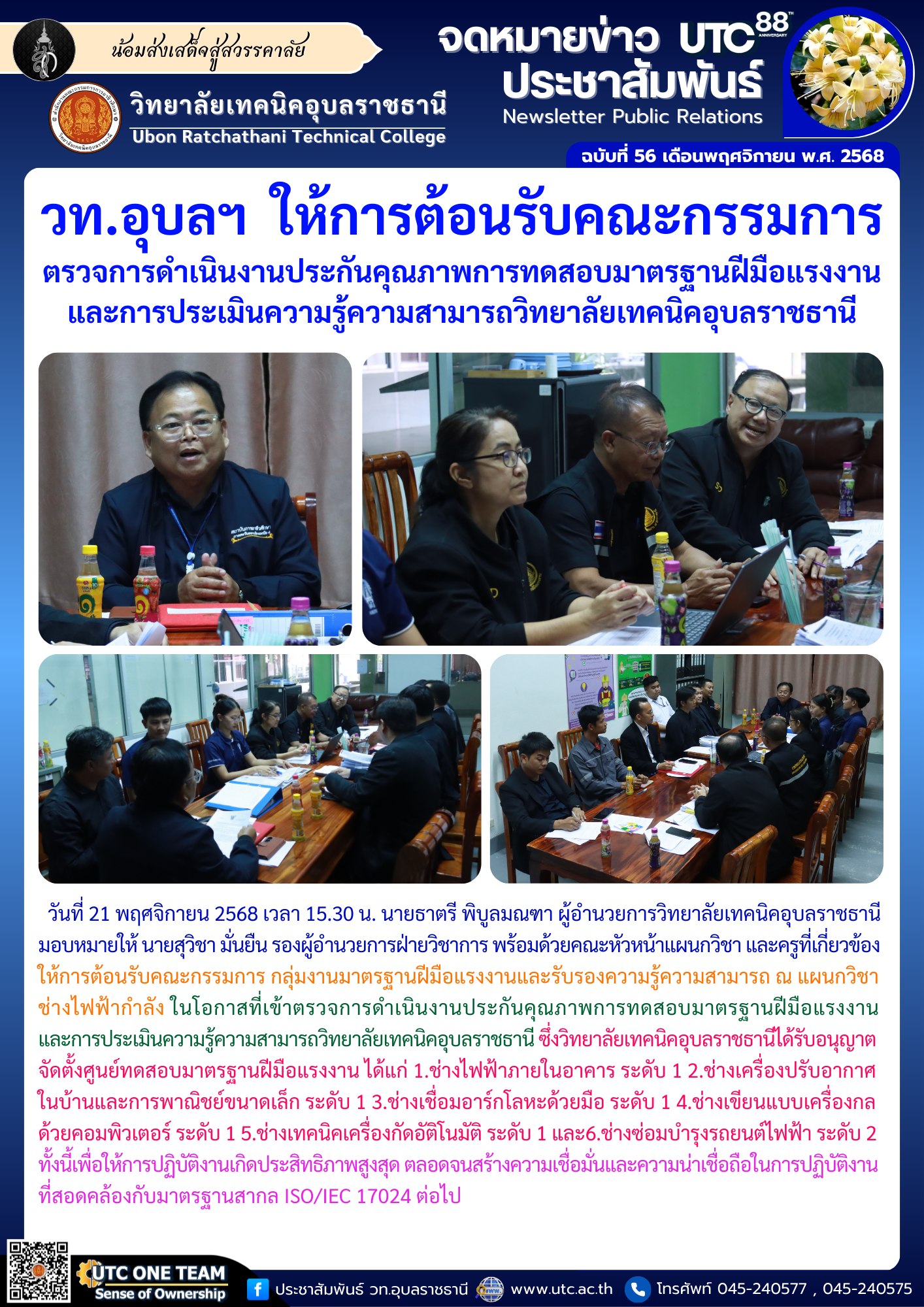วันที่ 21 พฤศจิกายน 2568 เวลา 15.30 น. นายธาตรี พิบูลมณฑา ผู้อำนวยการวิทยาลัยเทคนิคอุบลราชธานี มอบหมายให้ นายสุวิชา มั่นยืน รองผู้อำนวยการฝ่ายวิชาการ พร้อมด้วยคณะหัวหน้าแผนกวิชา และครูที่เกี่ยวข้อง ให้การต้อนรับคณะกรรมการ กลุ่มงานมาตรฐานฝีมือแรงงานและรับรองความรู้ความสามารถ ณ แผนกวิชาช่างไฟฟ้ากำลัง ในโอกาสที่เข้าตรวจการดำเนินงานประกันคุณภาพการทดสอบมาตรฐานฝีมือแรงงานและการประเมินความรู้ความสามารถวิทยาลัยเทคนิคอุบลราชธานี ซึ่งวิทยาลัยเทคนิคอุบลราชธานีได้รับอนุญาตจัดตั้งศูนย์ทดสอบมาตรฐานฝีมือแรงงาน ได้แก่ 1.ช่างไฟฟ้าภายในอาคาร ระดับ 1 2.ช่างเครื่องปรับอากาศในบ้านและการพาณิชย์ขนาดเล็ก ระดับ 1 3.ช่างเชื่อมอาร์กโลหะด้วยมือ ระดับ 1 4.ช่างเขียนแบบเครื่องกลด้วยคอมพิวเตอร์ ระดับ 1 5.ช่างเทคนิคเครื่องกัดอัติโนมัติ ระดับ 1 และ6.ช่างซ่อมบำรุงรถยนต์ไฟฟ้า ระดับ 2 ทั้งนี้เพื่อให้การปฏิบัติงานเกิดประสิทธิภาพสูงสุด ตลอดจนสร้างความเชื่อมั่นและความน่าเชื่อถือในการปฏิบัติงานที่สอดคล้องกับมาตรฐานสากล ISO/IEC 17024 ต่อไป #เรียนดีมีคุณธรรม