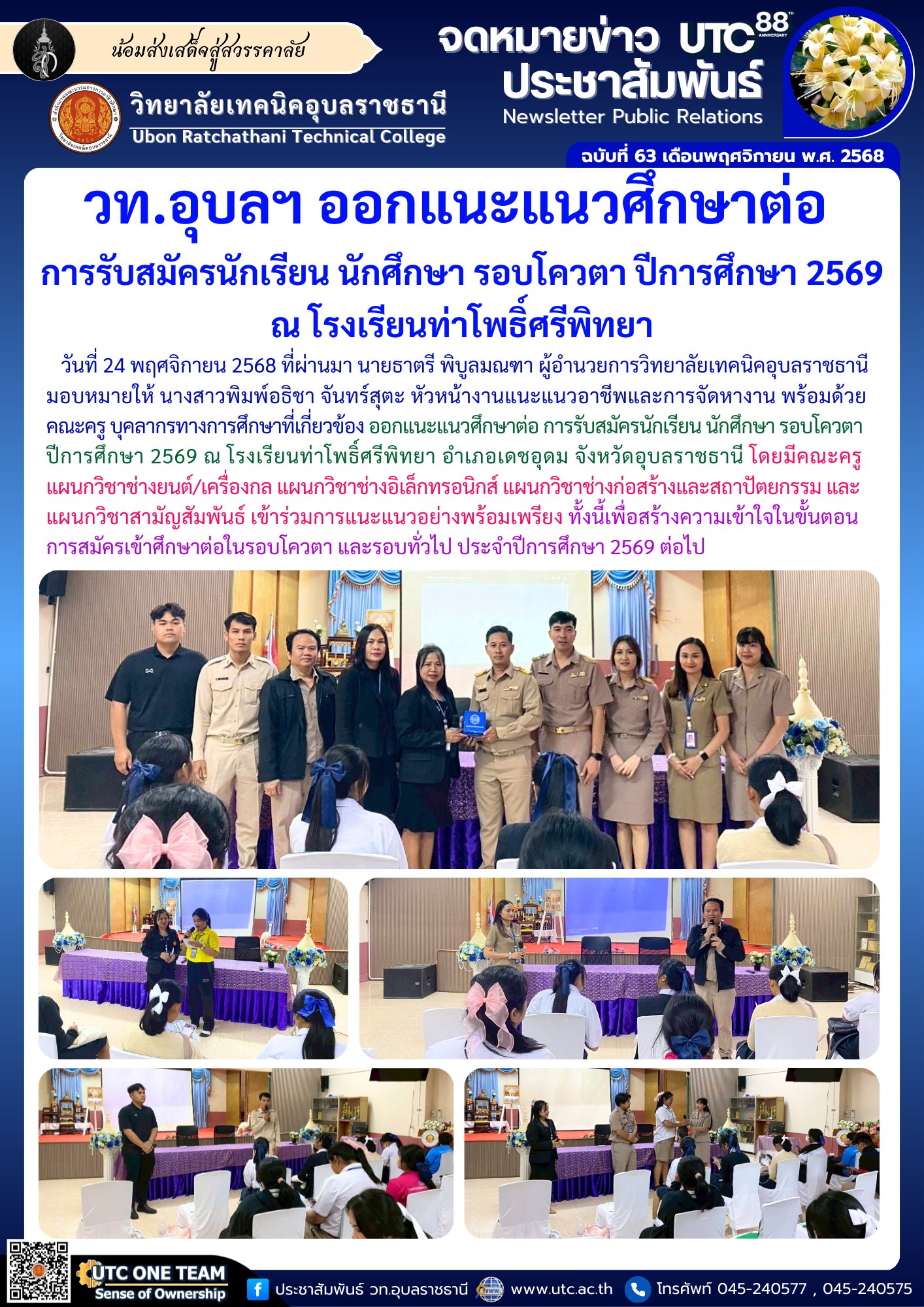 วท.อุบลฯ ออกแนะแนวศึกษาต่อ การรับสมัครนักเรียน นักศึกษา รอบโควตา ปีการศึกษา 2569 ณ โรงเรียนท่าโพธิ์ศรีพิทยา