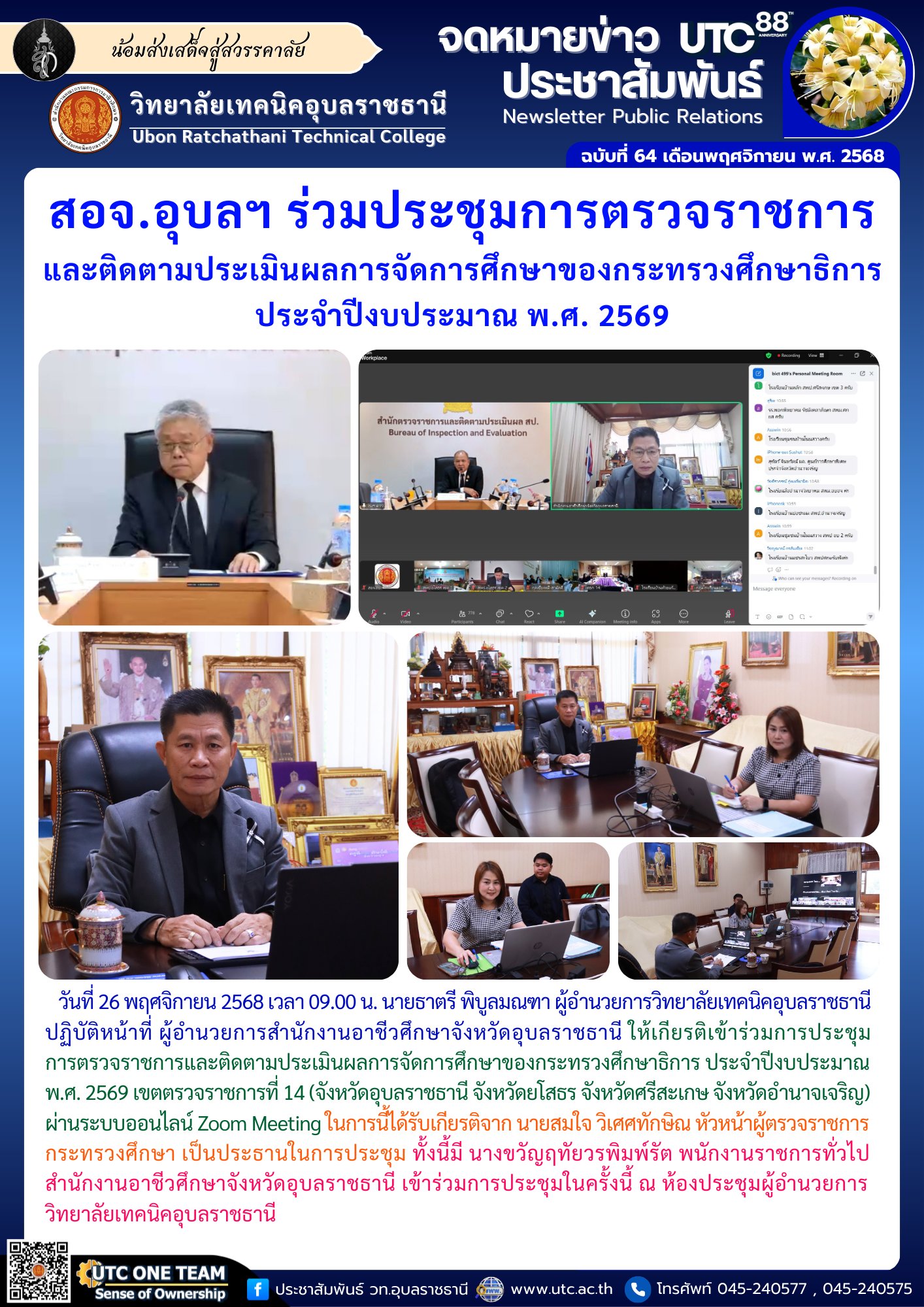 วันที่ 26 พฤศจิกายน 2568 เวลา 09.00 น. นายธาตรี พิบูลมณฑา ผู้อำนวยการวิทยาลัยเทคนิคอุบลราชธานี ปฏิบัติหน้าที่ ผู้อำนวยการสำนักงานอาชีวศึกษาจังหวัดอุบลราชธานี ให้เกียรติเข้าร่วมการประชุมการตรวจราชการและติดตามประเมินผลการจัดการศึกษาของกระทรวงศึกษาธิการ ประจำปีงบประมาณ พ.ศ. 2569 เขตตรวจราชการที่ 14 (จังหวัดอุบลราชธานี จังหวัดยโสธร จังหวัดศรีสะเกษ จังหวัดอำนาจเจริญ) ผ่านระบบออนไลน์ Zoom Meeting ในการนี้ได้รับเกียรติจาก นายสมใจ วิเศศทักษิณ หัวหน้าผู้ตรวจราชการกระทรวงศึกษา เป็นประธานในการประชุม ทั้งนี้มี นางขวัญฤทัยวรพิมพ์รัต พนักงานราชการทั่วไป สำนักงานอาชีวศึกษาจังหวัดอุบลราชธานี เข้าร่วมการประชุมในครั้งนี้ ณ ห้องประชุมผู้อำนวยการวิทยาลัยเทคนิคอุบลราชธานี