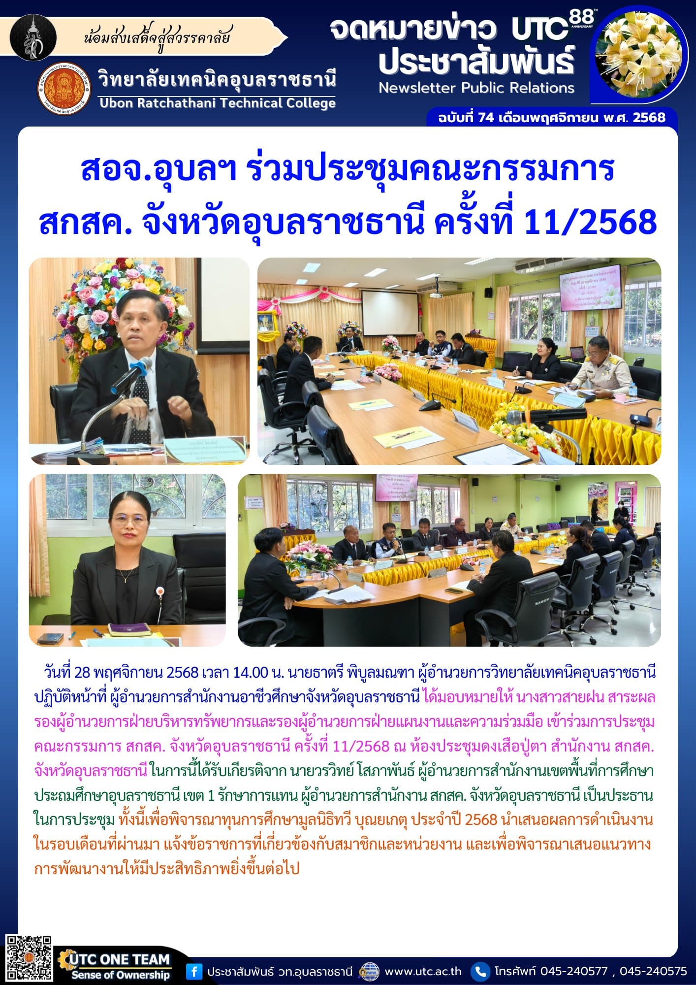 วันที่ 28 พฤศจิกายน 2568 เวลา 14.00 น. นายธาตรี พิบูลมณฑา ผู้อำนวยการวิทยาลัยเทคนิคอุบลราชธานี ปฏิบัติหน้าที่ ผู้อำนวยการสำนักงานอาชีวศึกษาจังหวัดอุบล ราชธานี ได้มอบหมายให้ นางสาวสายฝน สาระผล รองผู้อำนวยการฝ่ายบริหารทรัพยากรและรองผู้อำนวยการฝ่ายแผนงานและความร่วมมือ เข้าร่วมการประชุมคณะกรรมการ สกสค. จังหวัดอุบลราชธานี ครั้งที่ 11/2568 ณ ห้องประชุมดงเสือปู่ตา สำนักงาน สกสค. จังหวัดอุบลราชธานี ในการนี้ได้รับเกียรติจาก นายวรวิทย์ โสภาพันธ์ ผู้อำนวยการสำนักงานเขตพื้นที่การศึกษาประถมศึกษาอุบลราชธานี เขต 1 รักษาการแทน ผู้อำนวยการสำนักงาน สกสค. จังหวัดอุบลราชธานี เป็นประธานในการประชุม ทั้งนี้เพื่อพิจารณาทุนการศึกษามูลนิธิทวี บุณยเกตุ ประจำปี 2568 นำเสนอผลการดำเนินงานในรอบเดือนที่ผ่านมา แจ้งข้อราชการที่เกี่ยวข้องกับสมาชิกและหน่วยงาน และเพื่อพิจารณาเสนอแนวทางการพัฒนางานให้มีประสิทธิภาพยิ่งขึ้นต่อไป