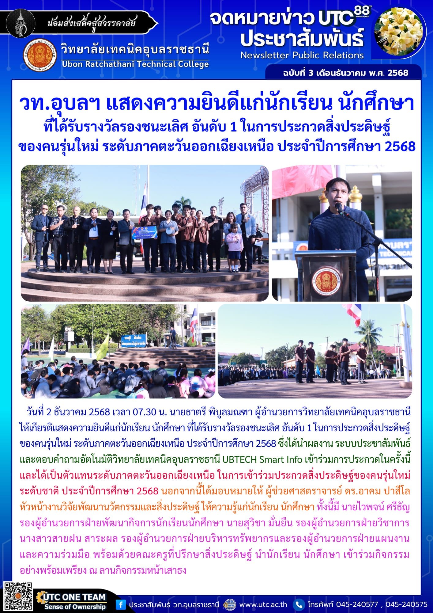 วท.อุบลฯ แสดงความยินดีแก่นักเรียน นักศึกษา ที่ได้รับรางวัลรองชนะเลิศ อันดับ 1 ในการประกวดสิ่งประดิษฐ์ของคนรุ่นใหม่ ระดับภาคตะวันออกเฉียงเหนือ ประจำปีการศึกษา 2568