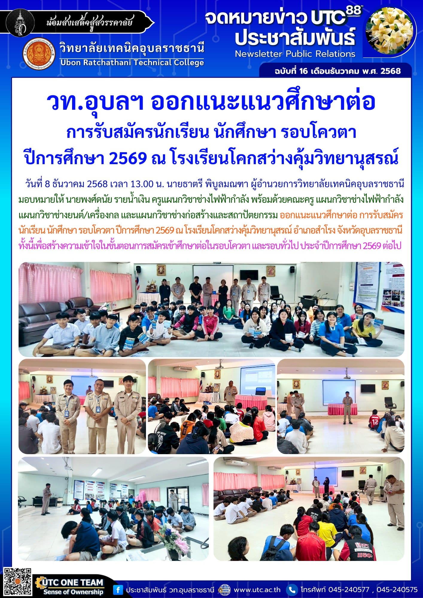 วท.อุบลฯ ออกเเนะเเนวศึกษาต่อ การรับสมัครนักเรียน นักศึกษา รอบโควตา ปีการศึกษา 2569 ณ โรงเรียนโคกสว่างคุ้มวิทยานุสรณ์