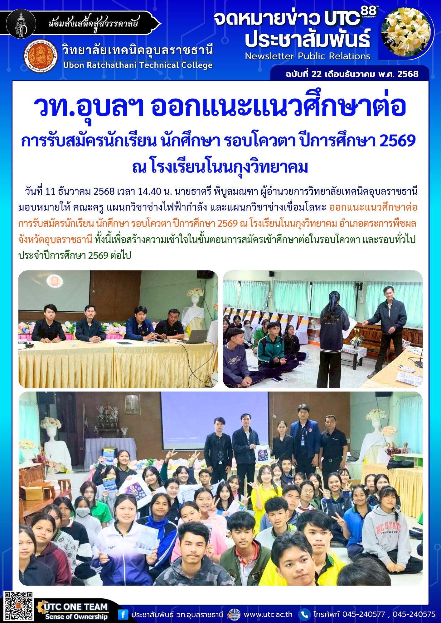 วท.อุบลฯ ออกแนะแนวศึกษาต่อ การรับสมัครนักเรียน นักศึกษา รอบโควตา ปีการศึกษา 2569 ณ โรงเรียนโนนกุงวิทยาคม