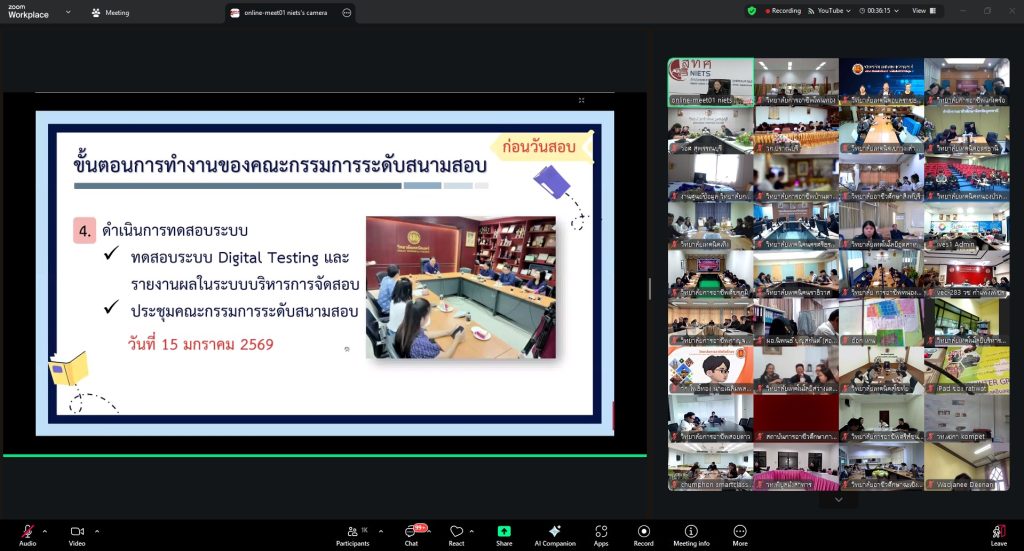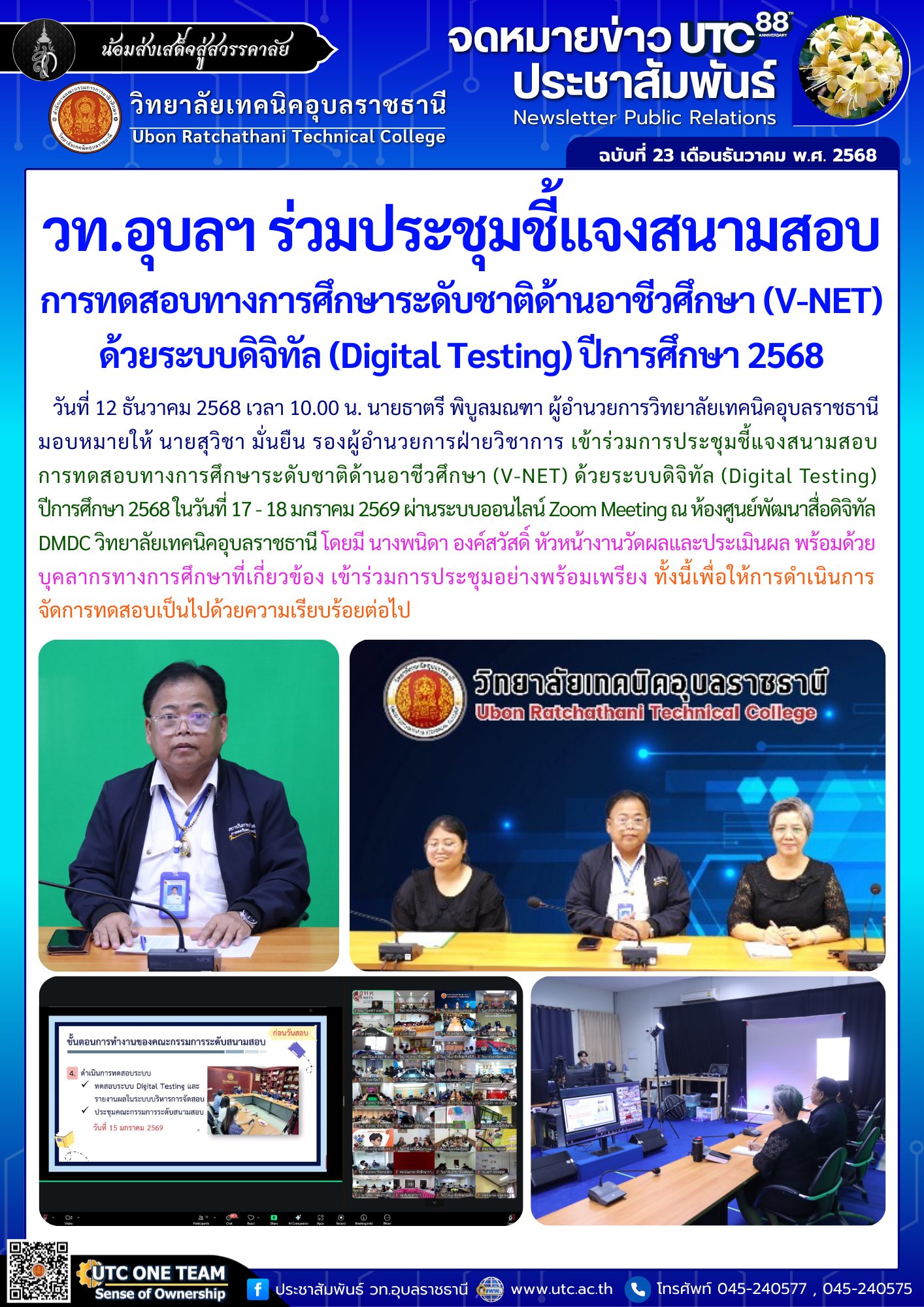 วันที่ 12 ธันวาคม 2568 เวลา 10.00 น. นายธาตรี พิบูลมณฑา ผู้อำนวยการวิทยาลัยเทคนิคอุบลราชธานี มอบหมายให้ นายสุวิชา มั่นยืน รองผู้อำนวยการฝ่ายวิชาการ เข้าร่วมการประชุมชี้แจงสนามสอบ การทดสอบทางการศึกษาระดับชาติด้านอาชีวศึกษา (V-NET) ด้วยระบบดิจิทัล (Digital Testing) ปีการศึกษา 2568 ในวันที่ 17 – 18 มกราคม 2569 ผ่านระบบออนไลน์ Zoom Meeting ณ ห้องศูนย์พัฒนาสื่อดิจิทัล DMDC วิทยาลัยเทคนิคอุบลราชธานี ในการนี้มี นางพนิดา องค์สวัสดิ์ หัวหน้างานวัดผลและประเมินผล และบุคลากรทางการศึกษาที่เกี่ยวข้อง เข้าร่วมการประชุมอย่างพร้อมเพรียง ทั้งนี้เพื่อให้การดำเนินการจัดการทดสอบเป็นไปด้วยความเรียบร้อยต่อไป