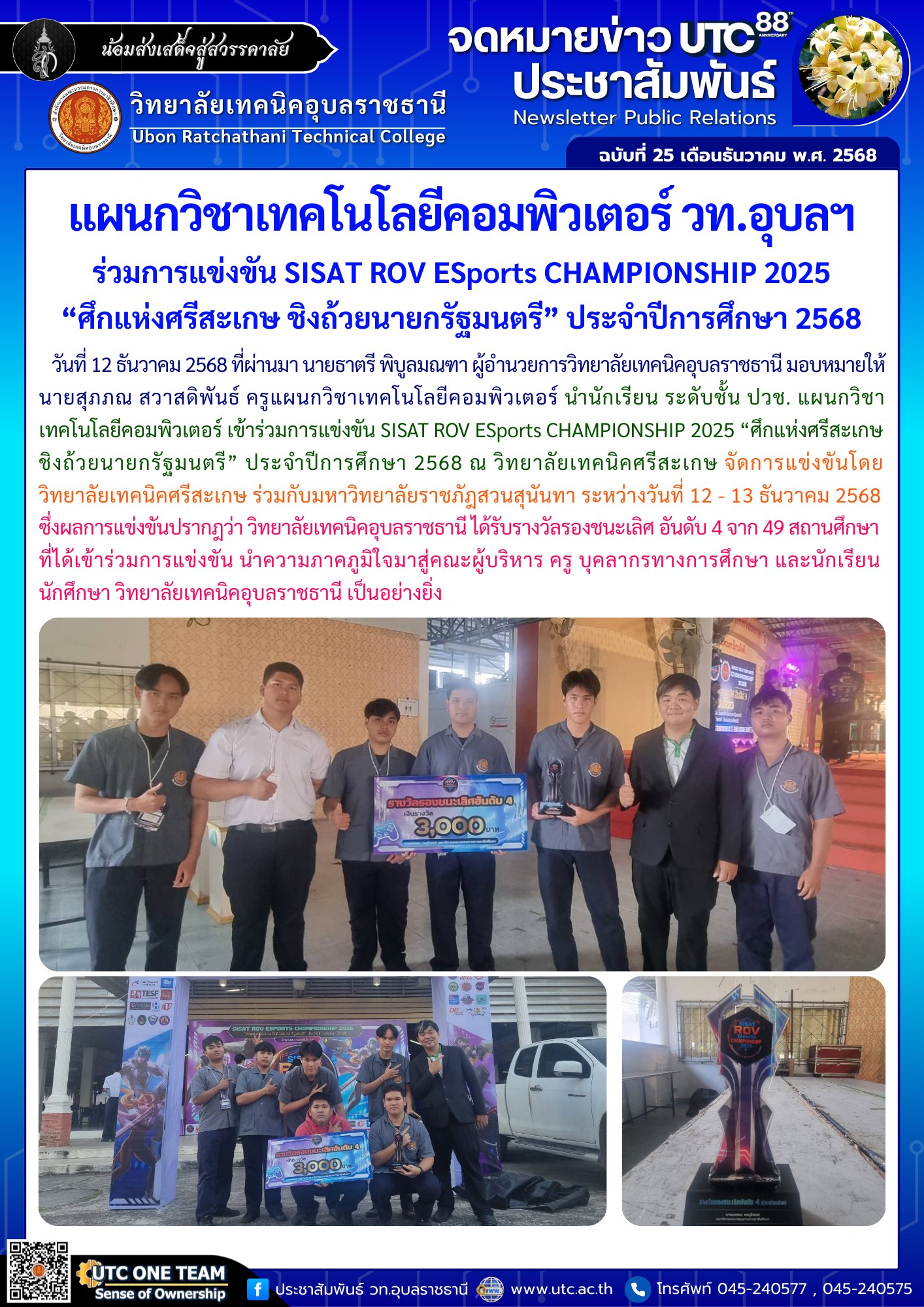 วันที่ 12 ธันวาคม 2568 ที่ผ่านมา นายธาตรี พิบูลมณฑา ผู้อำนวยการวิทยาลัยเทคนิคอุบลราชธานี มอบหมายให้ นายสุภภณ สวาสดิพันธ์ ครูแผนกวิชาเทคโนโลยีคอมพิวเตอร์ นำนักเรียน ระดับชั้น ปวช. แผนกวิชาเทคโนโลยีคอมพิวเตอร์ เข้าร่วมการแข่งขัน SISAT ROV ESports CHAMPIONSHIP 2025 “ศึกแห่งศรีสะเกษ ชิงถ้วยนายกรัฐมนตรี” ประจำปีการศึกษา 2568 ณ วิทยาลัยเทคนิคศรีสะเกษ ซึ่งจัดการแข่งขันโดย วิทยาลัยเทคนิคศรีสะเกษ ร่วมกับมหาวิทยาลัยราชภัฎสวนสุนันทา ระหว่างวันที่ 12 – 13 ธันวาคม 2568 ซึ่งผลการแข่งขันปรากฎว่า วิทยาลัยเทคนิคอุบลราชธานี ได้รับรางวัลรองชนะเลิศ อันดับ 4 จาก 49 สถานศึกษาที่ได้เข้าร่วมการแข่งขัน นำความภาคภูมิใจมาสู่คณะผู้บริหาร ครู บุคลากรทางการศึกษา และนักเรียน นักศึกษา วิทยาลัยเทคนิคอุบลราชธานี เป็นอย่างยิ่ง