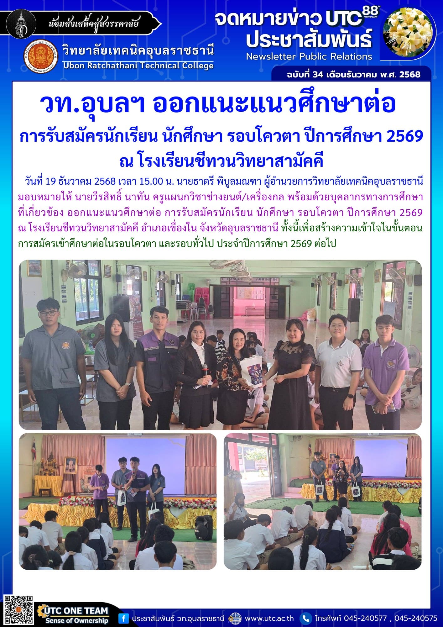 วท.อุบลฯ ออกแนะแนวศึกษาต่อ การรับสมัครนักเรียน นักศึกษา รอบโควตา ปีการศึกษา 2569 ณ โรงเรียนชีทวนวิทยาสามัคคี